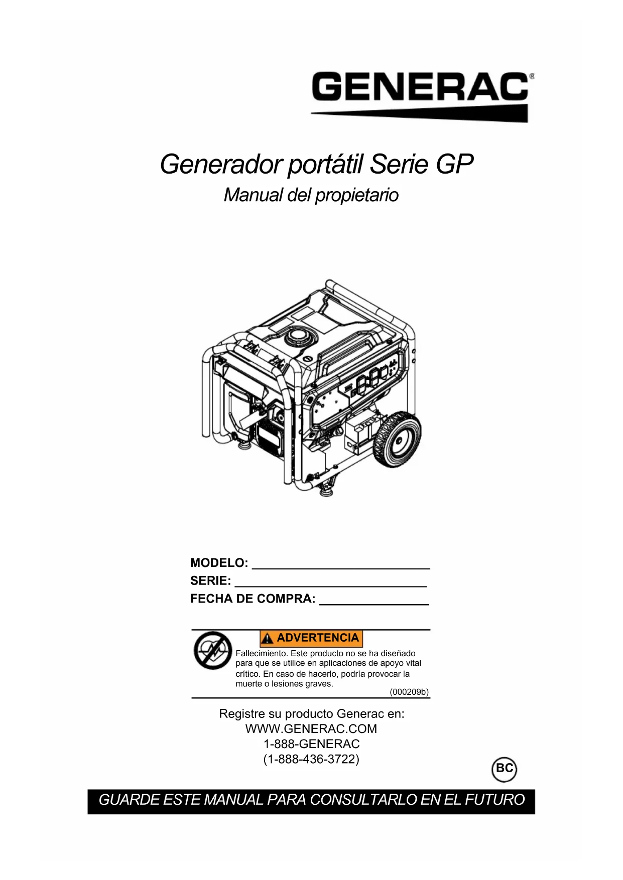 amarilla parpadea cuando/si el generador se apaga. Si COsense sigue fallando y se apaga, póngase en contacto con un IASD. PROBLEMA CAUSA SOLUCCIÓN26 Manual del usuario del generador portátil Diagrama de cableadoManual del usuario del generador portátil 27 Esta página se dejó en blanco intencionalmente.28 Manual del usuario del generador portátil Esta página se dejó en blanco intencionalmente.Manual del usuario del generador portátil 29 Esta página se dejó en blanco intencionalmente.N.º de pieza A0001914274 Rev. D 02/12/2022 ©2022 Generac Power Systems, Inc. Reservados todos los derechos Las especificaciones están sujetas a cambios sin previo aviso. No se permite la reproducción en ningún formato sin el consentimiento previo por escrito de Generac Power Systems, Inc. Generac Power Systems, Inc. S45 W29290 Hwy. 59 Waukesha, WI 53189 1-888-GENERAC (1-888-436-3722) www.generac.comGénératrice portable Série GP Guide du propriétaire MODÈLE :________________________