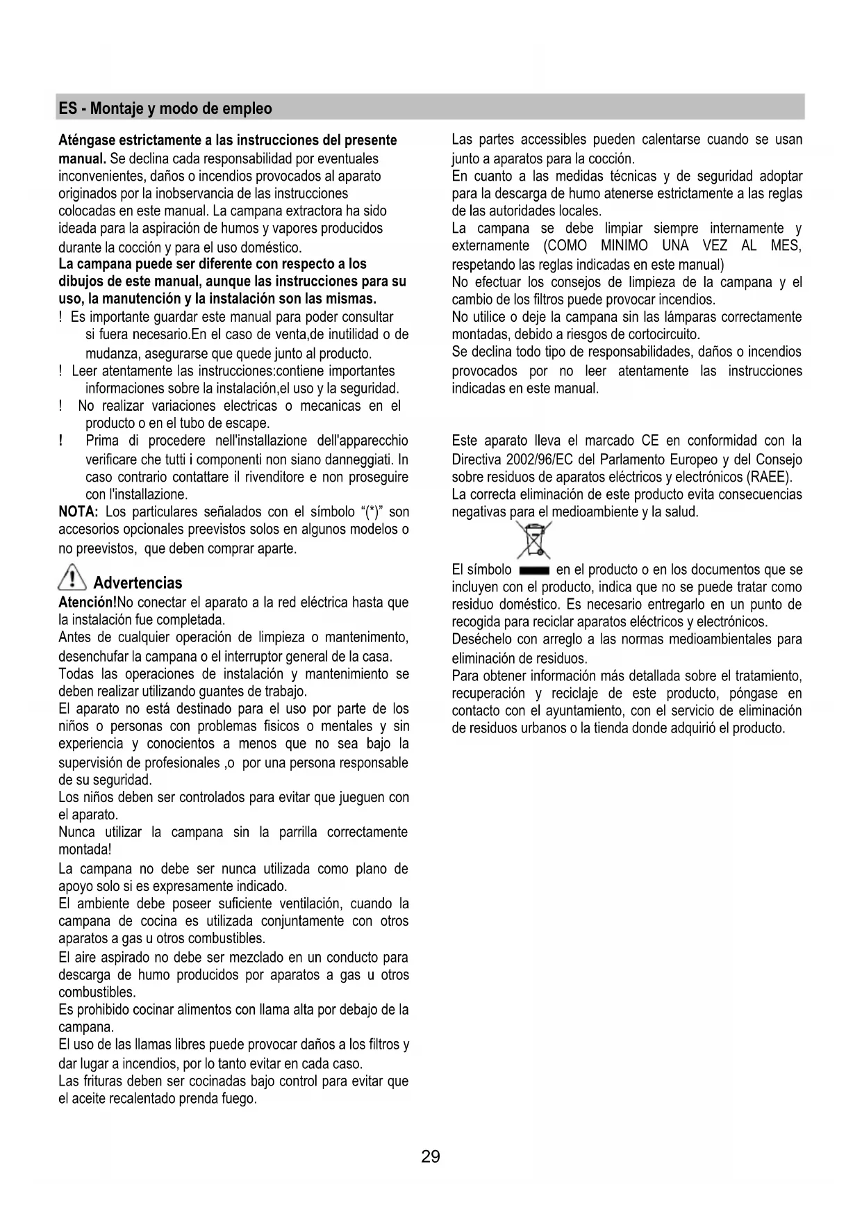 - NIET wasbaar koolstoffilter. Wasbaar koolstoffilter De koolstoffilter kan om de twee maanden gewassen worden in warm water en met geschikte wasmiddelen of in de vaatmachine op 65°C (in het geval van een reiniging in de vaatmachine voer een volledige wascyclus uit en zonder vaten). Verwijder het overtollige water zonder de filter te beschadigen, daarna het matje uit de plastic structuur verwijderen en om deze goed te drogen doe het matje in de over voor 10 minuten op 100°C. Vervang het matje om de 3 jaar en elke keer dat het doek beschadigt is. NIET wasbaar koolstoffilter De verzadiging van de koolstoffilter vindt plaats na een min of meer geprolongeerd gebruik en hangt af van het soort koken en de regelmaat waarmee de vetfilter wordt gewassen. In ieder geval moet de filter minstens om de 4 maanden vervangen worden. Het kan NIET gewassen of opnieuw gebruikt worden Montage Maak het koolstoffilter eerst aan de achterzijde op het metalen lipje van de kap vast en vervolgens aan de voorzijde, met de twee knoppen. Demontage Verwijder het koolstoffilter door de knoppen die hem aan de kap bevestigen met 90° te draaien. Vervanging lampjes De kap is voorzien van een verlichtingssysteem gebaseerd op de LEDDEN technologie. De Ledden zorgen voor een optimale verlichting, voor een 10 maal langere tijdsduur ten opzichte van de traditionele lampjes en een elektriciteitsbesparing van wel 90%. Voor de vervanging neem contact op met de technische assistentie.29 ES - Montaje y modo de empleo Aténgase estrictamente a las instrucciones del presente manual. Se declina cada responsabilidad por eventuales inconvenientes, daños o incendios provocados al aparato originados por la inobservancia de las instrucciones colocadas en este manual. La campana extractora ha sido ideada para la aspiración de humos y vapores producidos durante la cocción y para el uso doméstico. La campana puede ser diferente con respecto a los dibujos de este manual, aunque las instrucciones para su uso, la manutención y la instalación son las mismas. ! Es importante guardar este manual para poder consultar si fuera necesario.En el caso de venta,de inutilidad o de mudanza, asegurarse que quede junto al producto. ! Leer atentamente las instrucciones:contiene importantes informaciones sobre la instalación,el uso y la seguridad. ! No realizar variaciones electricas o mecanicas en el producto o en el tubo de escape. ! Prima di procedere nell'installazione dell'apparecchio verificare che tutti i componenti non siano danneggiati. In caso contrario contattare il rivenditore e non proseguire con l'installazione. NOTA: Los particulares señalados con el símbolo “(*)” son accesorios opcionales preevistos solos en algunos modelos o no preevistos, que deben comprar aparte. Advertencias Atención!No conectar el aparato a la red eléctrica hasta que la instalación fue completada. Antes de cualquier operación de limpieza o mantenimento, desenchufar la campana o el interruptor general de la casa. Todas las operaciones de instalación y mantenimiento se deben realizar utilizando guantes de trabajo. El aparato no está destinado para el uso por parte de los niños o personas con problemas fisicos o mentales y sin experiencia y conocientos a menos que no sea bajo la supervisión de profesionales ,o por una persona responsable de su seguridad. Los niños deben ser controlados para evitar que jueguen con el aparato. Nunca utilizar la campana sin la parrilla correctamente montada! La campana no debe ser nunca utilizada como plano de apoyo solo si es expresamente indicado. El ambiente debe poseer suficiente ventilación, cuando la campana de cocina es utilizada conjuntamente con otros aparatos a gas u otros combustibles. El aire aspirado no debe ser mezclado en un conducto para descarga de humo producidos por aparatos a gas u otros combustibles. Es prohibido cocinar alimentos con llama alta por debajo de la campana. El uso de las llamas libres puede provocar daños a los filtros y dar lugar a incendios, por lo tanto evitar en cada caso. Las frituras deben ser cocinadas bajo control para evitar que el aceite recalentado prenda fuego. Las partes accessibles pueden calentarse cuando se usan junto a aparatos para la cocción. En cuanto a las medidas técnicas y de seguridad adoptar para la descarga de humo atenerse estrictamente a las reglas de las autoridades locales. La campana se debe limpiar siempre internamente y externamente (COMO MINIMO UNA VEZ AL MES, respetando las reglas indicadas en este manual) No efectuar los consejos de limpieza de la campana y el cambio de los filtros puede provocar incendios. No utilice o deje la campana sin las lámparas correctamente montadas, debido a riesgos de cortocircuito. Se declina todo tipo de responsabilidades, daños o incendios provocados por no leer atentamente las instrucciones indicadas en este manual.
