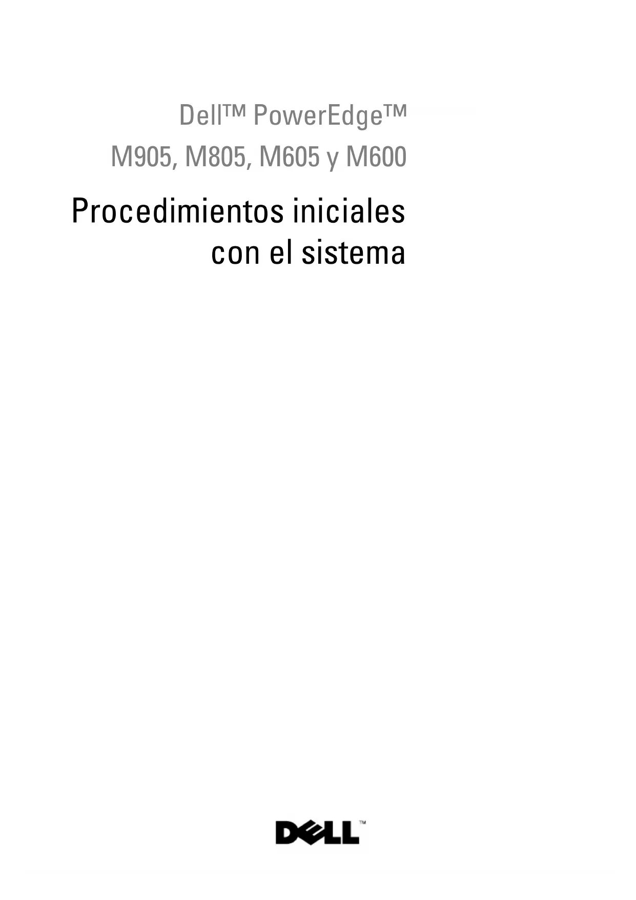 - Es posible que se incluyan notas de la versión o archivos Léame para proporcionar actualizaciones de última hora relativas al sistema o a la documentación, o material de consulta técnica avanzada destinado a técnicos o usuarios experimentados. Obtención de asistencia técnica Si no comprende algún procedimiento descrito en esta guía o si el sistema no funciona del modo esperado, consulte el Manual del propietario del hardware. Tiene a su disposición el servicio de formación y certificación Dell para empresas. Para obtener más información, visite www.dell.com/training. Es posible que este servicio no se ofrezca en todas las regiones. Instalación y configuración PRECAUCIÓN: Antes de realizar el procedimiento siguiente, lea y siga las instrucciones de seguridad y la información importante sobre normativas incluidas con el sistema. Para obtener información adicional sobre prácticas recomendadas de seguridad, visite www.dell.com/regulatory_compliance. En esta sección se describen los pasos necesarios para configurar el sistema por primera vez. Desembalaje del sistema Desembale el sistema e identifique cada elemento. Guarde el material de embalaje por si lo necesita más adelante.168 Procedimientos iniciales con el sistema Instalación del sistema en un rack Después de leer las instrucciones de seguridad incluidas en la documentación del sistema relativa a la instalación del rack, instale el sistema en el rack. Consulte la documentación de instalación del rack para obtener instrucciones sobre la instalación del sistema en un rack. Para obtener pautas sobre alimentación y refrigeración, consulte información sobre la herramienta de planificación de la capacidad del rack (rack capacity planner) en www.dell.com. Instalación de los módulos de alta densidad Empezando por la parte superior, inserte los módulos en el alojamiento de izquierda a derecha. Una vez que el módulo de alta densidad esté bien instalado, el asa volverá a la posición de cierre.Procedimientos iniciales con el sistema 169 Conexión de los módulos CMC y KVM Conecte el cable serie y el cable de red del sistema de administración al módulo CMC. Si va a instalar un segundo módulo CMC opcional, conéctelo también. Si con el chasis se incluyen módulos de alta densidad M805 o M905 preinstalados, la versión del firmware de la CMC será 1.2 o superior. Conecte el teclado, el ratón y el monitor al módulo iKVM opcional.170 Procedimientos iniciales con el sistema Conexión del sistema a la alimentación Conecte los cables de alimentación del sistema a las fuentes de alimentación. AVISO: Para evitar que los cables de alimentación se desconecten acciden- talmente, utilice el gancho de plástico de cada fuente de alimentación para fijar el cable a la fuente de alimentación, y utilice la tira de velcro para fijar el cable a la barra liberadora de tensión. A continuación, conecte el otro extremo de los cables de alimentación a una fuente de energía distinta, como por ejemplo un sistema de alimentación ininterrumpida (SAI) o una unidad de distribución de alimentación (PDU). Encendido del sistema Presione el botón de encendido del alojamiento. El indicador de alimentación debería encenderse.Procedimientos iniciales con el sistema 171 Encendido de los módulos de alta densidad Presione el botón de encendido de cada módulo de alta densidad o encienda los módulos mediante el software de administración de sistemas.172 Procedimientos iniciales con el sistema Finalización de la configuración del sistema operativo Si ha adquirido un sistema operativo preinstalado, consulte la documentación del sistema operativo que se suministra con el sistema. Para instalar un sistema operativo por primera vez, consulte la Guía de instalación rápida. Asegúrese de que el sistema operativo está instalado antes de instalar hardware o software no adquirido con el sistema. Especificaciones técnicas Especificaciones del módulo de alta densidad Procesador Tipo de procesador PowerEdge M905 Cuatro procesadores AMD Opteron serie 8000 de dos o cuatro núcleos PowerEdge M805 Dos procesadores AMD Opteron serie 2000 de dos o cuatro núcleos PowerEdge M600 Uno o dos procesadores Intel Xeon de dos o cuatro núcleos PowerEdge M605 Uno o dos procesadores AMD Opteron serie 2000 de dos o cuatro núcleos Memoria Arquitectura PowerEdge M600 Módulos de memoria FB-DIMM clasificados para funcionar a 677 MHz PowerEdge M905, M805 y M605 Módulos de memoria DDR2 clasificados para funcionar a 677 MHz Zócalos de módulo de memoria PowerEdge M905 24 zócalos de 240 patas PowerEdge M805 16 zócalos de 240 patas PowerEdge M605 y M600 Ocho zócalos de 240 patasProcedimientos iniciales con el sistema 173 Capacidades del módulo de memoria 512 MB (PowerEdge M605 y M600), 1GB, 2GB, 4GB u 8GB RAM mínima Dos módulos de memoria por procesador PowerEdge M905 8 GB (ocho módulos de memoria de 1 GB) PowerEdge M805 4 GB (cuatro módulos de memoria de 1 GB) PowerEdge M600 y M605 1 GB (dos módulos de memoria de 512 MB) RAM máxima PowerEdge M905 192 GB PowerEdge M805 128 GB PowerEdge M600 y M605 64 GB Unidades Unidades de disco duro PowerEdge M805 y M905 Una o dos unidades de disco duro SAS de 2,5 pulgadas PowerEdge M600 y M605 Configuración SATA Una o dos unidades de disco duro SATA de 2,5 pulgadas Configuración SAS Una o dos unidades de disco duro SAS de 2,5 pulgadas NOTA: Las unidades de disco duro SAS y SATA no pueden combinarse en un módulo de alta densidad M600 o M605. Memoria (continuación)174 Procedimientos iniciales con el sistema Conectores Externos USB PowerEdge M805 y M905 Tres de 4 patas compatibles con USB 2.0 PowerEdge M600 y M605 Dos de 4 patas compatibles con USB 2.0 Internos Tarjeta SD (PowerEdge M805 y M905) Un conector para tarjetas SD Controladoras Ethernet Conjunto de chips PowerEdge M805 y M905 Cuatro puertos Ethernet con compatibilidad con TOE e inicio iSCSI a través de dos controladoras Ethernet Broadcom 57