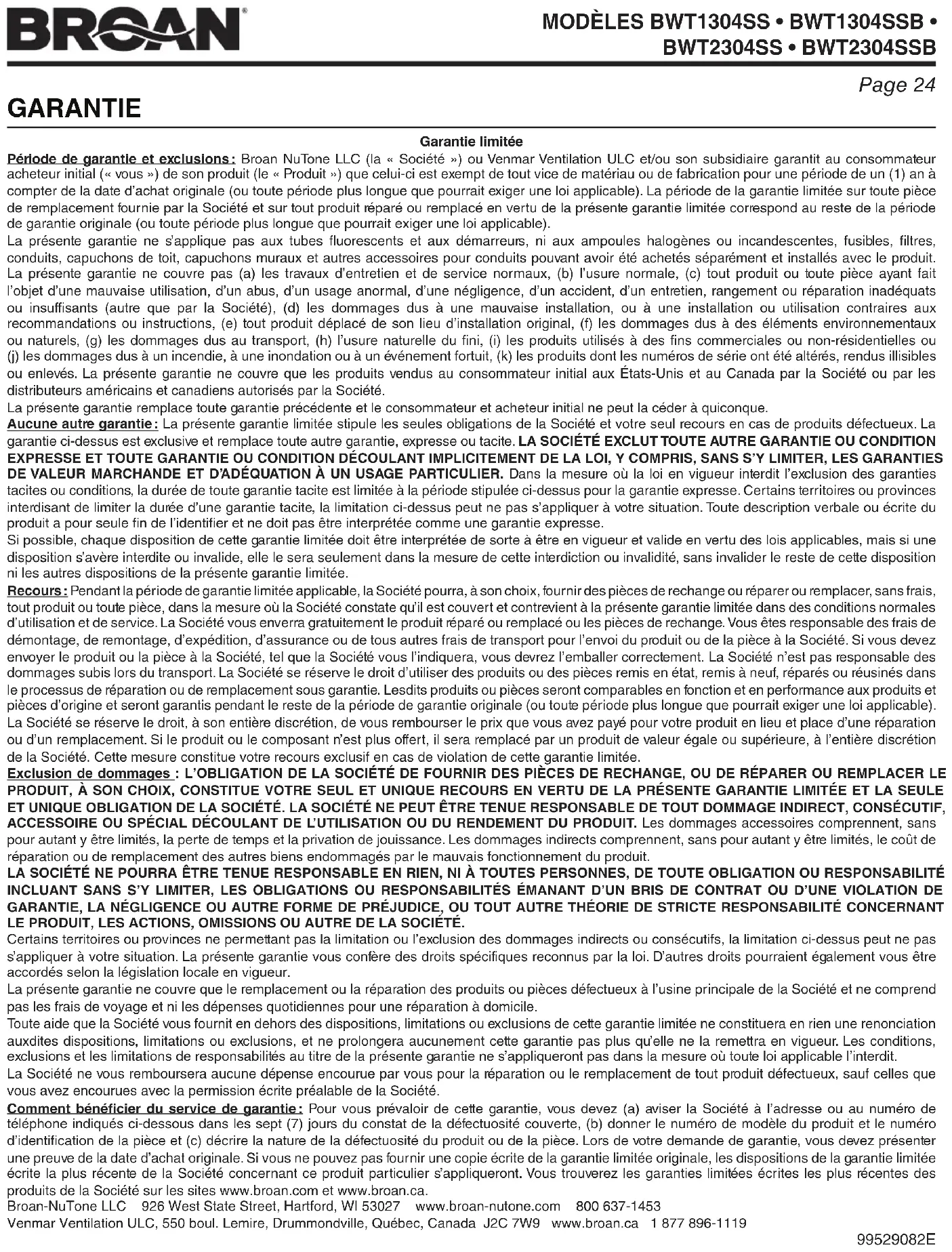 Garantía limitada Periodo y exclusiones de la garantía: Broan-NuTone LLC o Venmar Ventilation ULC (sea esta la “Compañía”) garantiza al consumidor comprador original de su producto (“usted”) que el producto (el “Producto”) estará libre de defectos en materiales o en mano de obra, por un periodo de un (1) año a partir de la fecha de compra original (o por un periodo mayor según sea requerido por la legislación aplicable). El periodo de garantía limitada para cualquier pieza de repuesto proporcionada por la compañía y para cualquier Producto reparado o reemplazado bajo esta garantía limitada debe ser lo que reste del periodo de garantía original (o por un periodo mayor según sea requerido por la legislación aplicable). Esta garantía no cubre arrancadores de lámparas fluorescentes, tubos, bombillas de halógeno e incandescentes, fusibles, filtros, conductos, tapas de techo, tapas de pared ni otros accesorios que pudieran ser comprados por separado e instalados con el producto. Esta garantía tampoco cubre (a) mantenimiento y servicio normal, (b) uso y desgaste normal, (c) Productos o piezas sujetos a mal uso, abuso, uso anormal, negligencia, accidente, mantenimiento inadecuado o insuficiente, almacenamiento o reparación (que no sea reparación por parte de la Compañía), (d) daños causados por instalación defectuosa, o bien instalación o uso contrario a las recomendaciones o instrucciones, (e) cualquier Producto que se haya movido de su punto de instalación original, (f) daños ocasionados por el medio ambiente o los elementos naturales, (g) daños en tránsito, (h) desgaste natural del acabado, (i) Productos en uso comercial o no residencial, o (j) daños ocasionados por incendio, inundación u otro caso fortuito o (k) Productos con un número de serie alterado, removido o mutilado. Esta garantía cubre solamente Productos vendidos a clientes originales en los Estados Unidos y Canadá por la Compañía o a distribuidores de EE. UU. y Canadá autorizados por la Compañía. Esta garantía sustituye todas las garantías anteriores y no es transferible del comprador consumidor original. No hay otras garantías: Esta garantía limitada contiene la única obligación de la Compañía y su único recurso ante productos defectuosos. Las garantías anteriores son exclusivas y en lugar de cualquier otra garantía, expresa o implícita. LA COMPAÑÍA NIEGA Y EXCLUYE CUALQUIER OTRA GARANTÍA EXPRESA, Y NIEGA Y EXCLUYE TODAS LAS GARANTÍAS IMPLÍCITAS, CONDICIONES Y ESTIPULACIONES IMPLICITAS POR LEY, INCLUYENDO, ENTRE OTRAS, LAS DE COMERCIALIZACIÓN Y APTITUD PARA UN PROPÓSITO EN PARTICULAR. Hasta el grado en que la ley aplicable prohíba la exclusión de las garantías implícitas, condiciones y estipulaciones, la duración de cualquier garantía implícita aplicable está limitada al periodo especificado para la garantía expresa antes mencionada. Algunas jurisdicciones no permiten limitaciones en la duración de una garantía implícita, así que la limitación anterior tal vez no aplique en su caso. Cualquier descripción verbal o escrita del Producto es para el único propósito de identificarlo y no deberá considerarse como una garantía expresa. Siempre que sea posible, toda disposición de esta garantía limitada deberá ser interpretada de tal forma que sea efectiva y válida de conformidad con la ley aplicable, pero si alguna disposición fuera considerada prohibida o inválida, quedará sin efecto solo en virtud de dicha prohibición o invalidez, sin invalidar el resto de dicha disposición o las demás disposiciones restantes de la garantía limitada. Recurso: Durante el periodo de garantía limitada aplicable, la Compañía, a su opción, suministrará piezas de repuesto, o reparará o reemplazará, sin cargo alguno, cualquier Producto o pieza del mismo, hasta el grado en que la Compañía lo encuentre cubierto bajo esta garantía limitada y en incumplimiento de la misma en condiciones normales de uso y servicio. La Compañía le enviará el Producto reparado o reemplazado o las piezas de repuesto sin cargo. Usted es responsable de todos los costos de retiro, reinstalación y envío, seguro u otros cargos de flete incurridos en el envío del Producto o pieza a la Compañía. Si debe enviar el Producto o la pieza a la Compañía, tal como lo indique la Compañía, debe empaquetar adecuadamente el Producto o la pieza: la Compañía no se hace responsable por los daños en tránsito. La Compañía se reserva el derecho de utilizar Productos o piezas reacondicionados, renovados, reparados o refabricados en el proceso de reemplazo o reparación de garantía. Dichos Productos y piezas serán comparables en función y desempeño a un Producto o una pieza original y tendrán garantía durante el resto del periodo de la garantía original (o po un periodo mayor según sea requerido por la legislación aplicable). La Compañía se reserva el derecho, a su sola discreción, a devolver el dinero que pagó por el Producto en lugar de la reparación o sustitución. Si el producto o componente ya no está disponible o esta descontinuado, el reemplazo podrá ser efectuado por un producto similar de igual o mayor valor, a criterio exclusivo de la Compañía. Este es su único y exclusivo recurso por incumplimiento de esta garantía limitada. Exclusión de daños: LA OBLIGACIÓN DE LA COMPAÑÍA DE SUMINISTRAR PIEZAS DE REPUESTO, O DE REPARAR O REEMPLAZAR, A OPCIÓN DE LA COMPAÑÍA, SERÁ SU ÚNICO Y EXCLUSIVO RECURSO BAJO ESTA GARANTÍA LIMITADA, Y LA ÚNICA Y EXCLUSIVA OBLIGACIÓN DE LA COMPAÑÍA. LA COMPAÑÍA NO SERÁ RESPONSABLE POR DAÑOS INCIDENTALES, INDIRECTOS, RESULTANTES O ESPECIALES QUE SURJAN POR EL USO O DESEMPEÑO DEL PRODUCTO, O EN RELACIÓN CON EL MISMO. Los daños incidentales incluyen pero no se limitan a daños tales como pérdida de uso. Los daños consecuentes incluyen pero no se limitan a los gastos de reparación o sustitución de otra propiedad