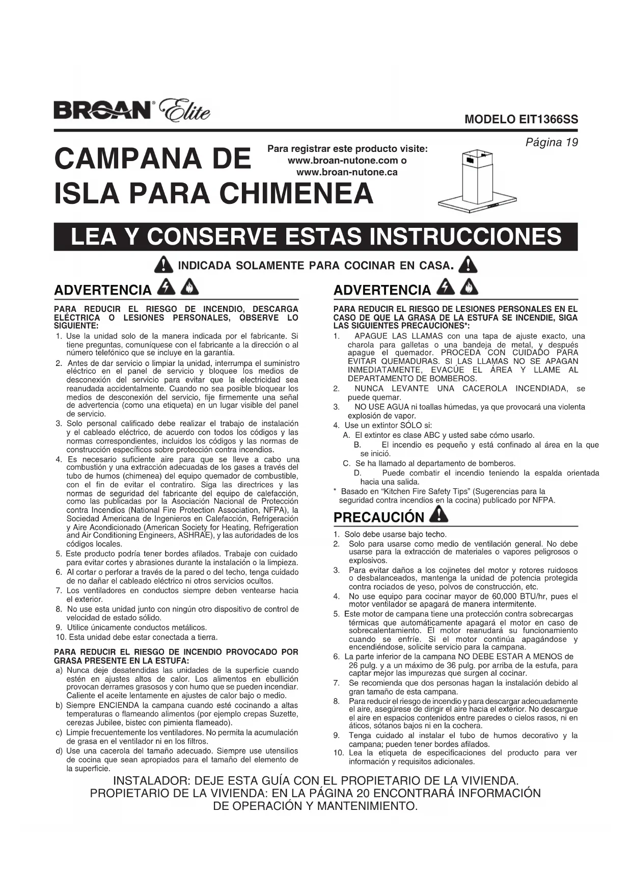 1. Solo debe usarse bajo techo.2. Solo para usarse como medio de ventilación general. No debe usarse para la extracción de materiales o vapores peligrosos o explosivos.3. Para evitar daños a los cojinetes del motor y rotores ruidosos o desbalanceados, mantenga la unidad de potencia protegida contra rociados de yeso, polvos de construcción, etc.4. No use equipo para cocinar mayor de 60,000 BTU/hr, pues el motor ventilador se apagará de manera intermitente.5. Este motor de campana tiene una protección contra sobrecargas térmicas que automáticamente apagará el motor en caso de sobrecalentamiento. El motor reanudará su funcionamiento cuando se enfríe. Si el motor continúa apagándose y encendiéndose, solicite servicio para la campana.6. La parte inferior de la campana NO DEBE ESTAR A MENOS de 26 pulg. y a un máximo de 36 pulg. por arriba de la estufa, para captar mejor las impurezas que surgen al cocinar.7. Se recomienda que dos personas hagan la instalación debido al gran tamaño de esta campana.8. Para reducir el riesgo de incendio y para descargar adecuadamente el aire, asegúrese de dirigir el aire hacia el exterior. No descargue el aire en espacios contenidos entre paredes o cielos rasos, ni en áticos, sótanos bajos ni en la cochera.9. Tenga cuidado al instalar el tubo de humos decorativo y la campana; pueden tener bordes afilados.10. Lea la etiqueta de especificaciones del producto para ver información y requisitos adicionales.INSTALADOR: DEJE ESTA GUÍA CON EL PROPIETARIO DE LA VIVIENDA.PROPIETARIO DE LA VIVIENDA: EN LA PÁGINA 20 ENCONTRARÁ INFORMACIÓN DEOPERACIÓN Y MANTENIMIENTO. ADVERTENCIA Para registrar este producto visite: www.broan-nutone.com owww.broan-nutone.caPágina 20