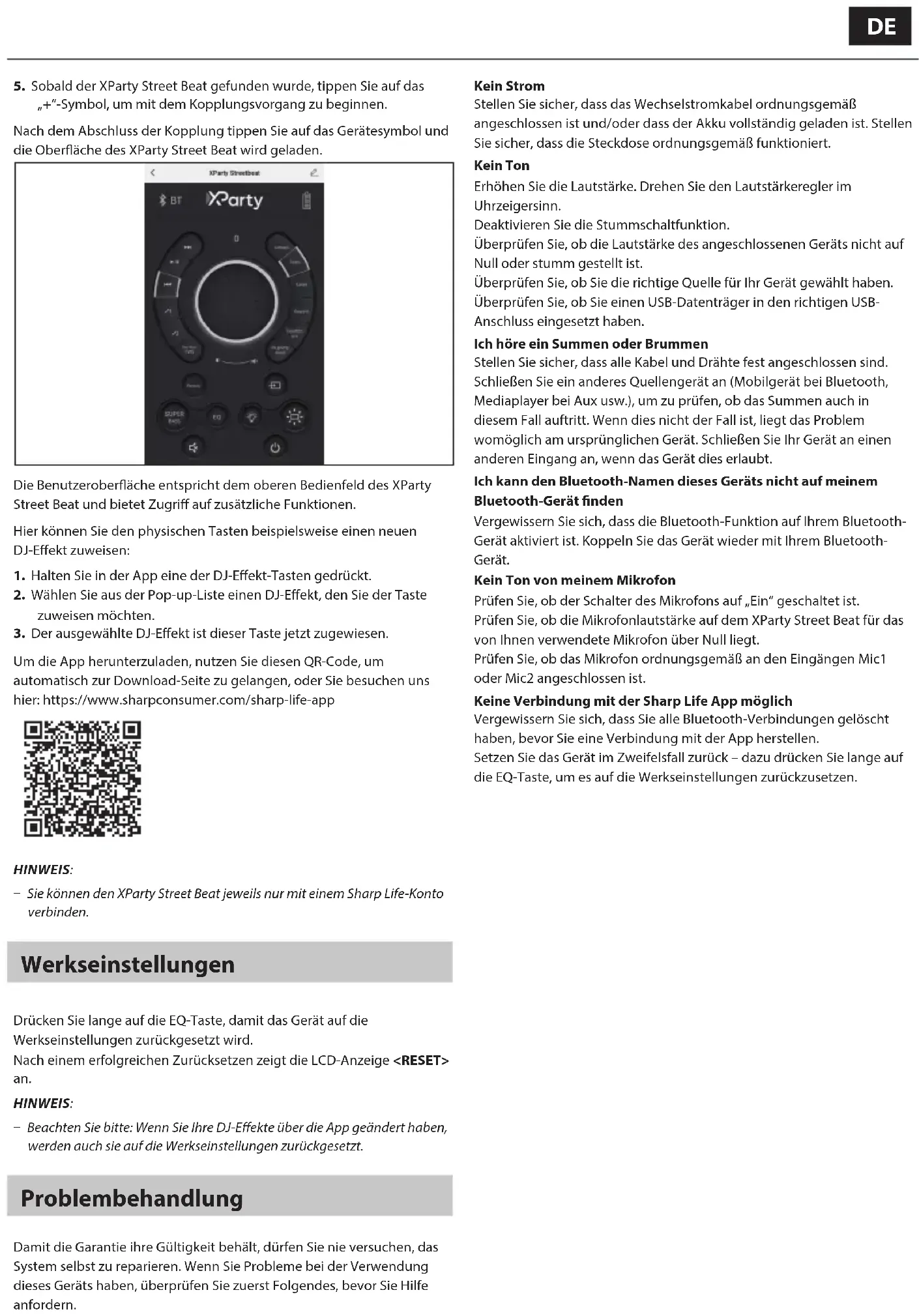 Para descargar la aplicación, utilice este código QR para ir automáticamente a la página de descargue o visite: https://www. sharpconsumer.com/sharp-life-app NOTA: ū Solo puede emparejar el altavoz XParty Street Beat a una cuenta Sharp Life a la vez. Restaurar valores por defecto Mantenga pulsado el botón EQ para restablecer la unidad a los ajustes de fábrica. Si el restablecimiento se completa correctamente, el LCD mostrará <RESET>. NOTA: ū Tenga en cuenta que los DJ FX volverán a sus posiciones de fábrica si las modicó a través de la aplicación. Resolución de problemas Para conservar la validez de la garantía, no intente reparar el sistema por sí mismo. Si observa problemas al usar esta unidad, revise los siguientes elementos antes de dirigirse al servicio técnico. Falta de alimentación Asegúrese de que el cable de CA está adecuadamente conectado o que la batería está completamente cargada. Asegúrese de que la toma de CA tiene corriente. No se oye sonido Aumente el volumen. Gire la perilla de control del volumen hacia la derecha. Desactive la función de silencio. Compruebe que el volumen en el dispositivo conectado no está en cero o silenciado. Compruebe que ha seleccionado la fuente correcta para su dispositivo. Compruebe que ha conectado un medio USB a un puerto USB correcto. Oigo como zumbidos y silbidos Asegúrese de que todos los cables están correctamente conectados. Conecte un dispositivo fuente diferente (dispositivo móvil en caso de conexión Bluetooth, reproductor de medios en caso de conexión auxiliar, etc.) para comprobar si el zumbido no desaparece. Si se deja de oír, el problema puede estar en el dispositivo original. Conecte el dispositivo auna entrada diferente si el dispositivo lo permite. No puedo encontrar el nombre Bluetooth de esta unidad en mi dispositivo Bluetooth Asegúrese de que la función Bluetooth está activada en su dispositivo Bluetooth. Vuelva a emparejar la unidad con su dispositivo Bluetooth. No se oye sonido desde mi micrófono Compruebe que el micrófono tiene el interruptor establecido en activado. Compruebe que el volumen de Mic en el altavoz XParty Street Beat está por encima de cero para el micrófono que está utilizando. Compruebe que el micrófono está conectado correctamente a las entradas Mic1 o Mic2. No puedo conectarme a la aplicación Sharp Life Asegúrese de que ha borrado todas las conexiones Bluetooth antes de conectarse a la aplicación. En caso de duda, restablezca la unidad manteniendo pulsado el botón EQ para restablecerla a los ajustes de fábrica.FR Consignes de sécurité importantes Veuillez suivre toutes les consignes de sécurité et tenir compte de tous les avertissements. Gardez ce manuel àtitre de référence. Ce symbole indique à l'utilisateur de consulter le manuel d'utilisation pour plus d'informations sur la sécurité, le fonctionnement et la maintenance. Ce symbole indique la présence d'une tension dangereuse non isolée à l'intérieur du produit, et pouvant être d'une magnitude susante pour constituer un risque de choc électrique pour les personnes. Se rapporte au courant alternatif (CA) Ce symbole indique que la tension nominale indiquée par le symbole est une tension alternative. Se rapporte aux équipements de classeII. Ce symbole indique que ce produit est doté d'un système de double isolation et ne nécessite pas de connexion de sécurité à la terre (masse). Précautions Dégâts