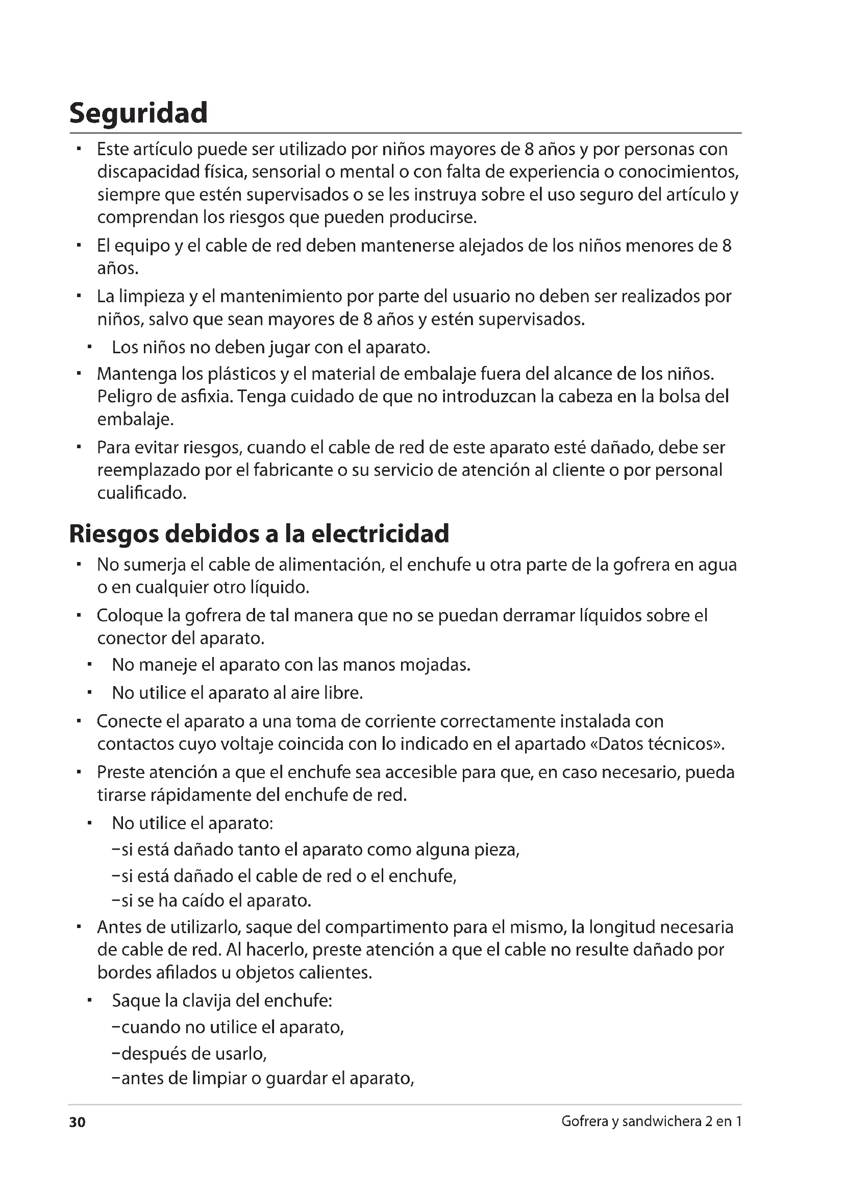 Gofrera y sandwichera 2 en 1 Seguridad Este artículo puede ser utilizado por niños mayores de 8 años y por personas con discapacidad física, sensorial o mental o con falta de experiencia o conocimientos, siempre que estén supervisados o se les instruya sobre el uso seguro del artículo y comprendan los riesgos que pueden producirse. El equipo y el cable de red deben mantenerse alejados de los niños menores de 8 años. La limpieza y el mantenimiento por parte del usuario no deben ser realizados por niños, salvo que sean mayores de 8 años y estén supervisados. Los niños no deben jugar con el aparato. Mantenga los plásticos y el material de embalaje fuera del alcance de los niños. Peligro de asfixia. Tenga cuidado de que no introduzcan la cabeza en la bolsa del embalaje. Para evitar riesgos, cuando el cable de red de este aparato esté dañado, debe ser reemplazado por el fabricante o su servicio de atención al cliente o por personal cualificado. Riesgos debidos a la electricidad No sumerja el cable de alimentación, el enchufe u otra parte de la gofrera en agua o en cualquier otro líquido. Coloque la gofrera de tal manera que no se puedan derramar líquidos sobre el conector del aparato. No maneje el aparato con las manos mojadas. No utilice el aparato al aire libre. Conecte el aparato a una toma de corriente correctamente instalada con contactos cuyo voltaje coincida con lo indicado en el apartado «Datos técnicos». Preste atención a que el enchufe sea accesible para que, en caso necesario, pueda tirarse rápidamente del enchufe de red. No utilice el aparato: − si está dañado tanto el aparato como alguna pieza, − si está dañado el cable de red o el enchufe, − si se ha caído el aparato. Antes de utilizarlo, saque del compartimento para el mismo, la longitud necesaria de cable de red. Al hacerlo, preste atención a que el cable no resulte dañado por bordes afilados u objetos calientes. Saque la clavija del enchufe: − cuando no utilice el aparato, − después de usarlo, − antes de limpiar o guardar el aparato,Seguridad
