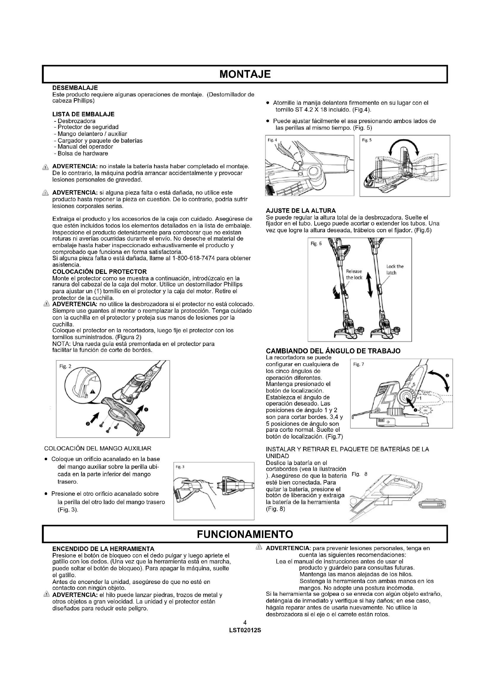 CAMBIANDO DEL ÁNGULO DE TRABAJO La recortadora se puede configurar en cualquiera de los cinco ángulos de operación diferentes. Mantenga presionado el botón de localización. Establezca el ángulo de operación deseado. Las posiciones de ángulo 1 y 2 son para cortar bordes. 3,4 y 5 posiciones de ángulo son para corte normal. Suelte el botón de localización. (Fig.7) INSTALAR Y RETIRAR EL PAQUETE DE BATERÍAS DE LA UNIDAD Deslice la batería en el cortabordes (vea la ilustración ). Asegúrese de que la batería esté bien conectada. Para quitar la batería, presione el botón de liberación y extraiga la batería de la herramienta (Fig. 8) DESEMBALAJE Este producto requiere algunas operaciones de montaje. (Destornillador de cabeza Phillips) LISTA DE EMBALAJE - Desbrozadora - Protector de seguridad - Mango delantero / auxiliar - Cargador y paquete de baterías - Manual del operador - Bolsa de hardware ADVERTENCIA: no instale la batería hasta haber completado el montaje. De lo contrario, la máquina podría arrancar accidentalmente y provocar lesiones personales de gravedad. ADVERTENCIA: si alguna pieza falta o está dañada, no utilice este producto hasta reponer la pieza en cuestión. De lo contrario, podría sufrir lesiones corporales serias. Extraiga el producto y los accesorios de la caja con cuidado. Asegúrese de que estén incluidos todos los elementos detallados en la lista de embalaje. Inspeccione el producto detenidamente para corroborar que no existan roturas ni averías ocurridas durante el envío. No deseche el material de embalaje hasta haber inspeccionado exhaustivamente el producto y comprobado que funciona en forma satisfactoria. Si alguna pieza falta o está dañada, llame al 1-800-618-7474 para obtener asistencia. COLOCACIÓN DEL PROTECTOR Monte el protector como se muestra a continuación, introdúzcalo en la ranura del cabezal de la caja del motor. Utilice un destornillador Phillips para ajustar un (1) tornillo en el protector y la caja del motor. Retire el protector de la cuchilla. ADVERTENCIA: no utilice la desbrozadora si el protector no está colocado. Siempre use guantes al montar o reemplazar la protección. Tenga cuidado con la cuchilla en el protector y proteja sus manos de lesiones por la cuchilla. Coloque el protector en la recortadora, luego fije el protector con los tornillos suministrados. (Figura 2) NOTA: Una rueda guía está premontada en el protector para facilitar la función de corte de bordes. ENCENDIDO DE LA HERRAMIENTA Presione el botón de bloqueo con el dedo pulgar y luego apriete el gatillo con los dedos. (Una vez que la herramienta está en marcha, puede soltar el botón de bloqueo). Para apagar la máquina, suelte el gatillo. Antes de encender la unidad, asegúrese de que no esté en contacto con ningún objeto. ADVERTENCIA: el hilo puede lanzar piedras, trozos de metal y otros objetos a gran velocidad. La unidad y el protector están diseñados para reducir este peligro. ADVERTENCIA: para prevenir lesiones personales, tenga en cuenta las siguientes recomendaciones: Lea el manual de instrucciones antes de usar el producto y guárdelo para consultas futuras. Mantenga las manos alejadas de los hilos. Sostenga la herramienta con ambas manos en los mangos. No adopte una postura incómoda. Si la herramienta se golpea o se enreda con algún objeto extraño, deténgala de inmediato y verifique si hay daños; en ese caso, hágala reparar antes de usarla nuevamente. No utilice la desbrozadora si el eje o el carrete están rotos. MONTAJE FUNCIONAMIENTO