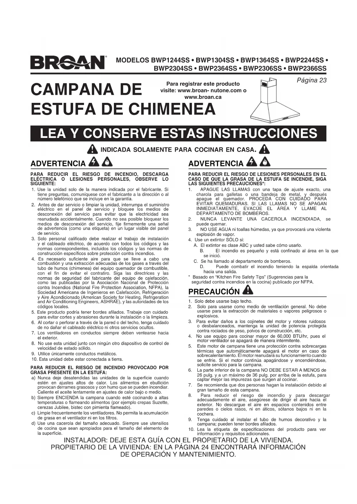 1. Solo debe usarse bajo techo.2. Solo para usarse como medio de ventilación general. No debe usarse para la extracción de materiales o vapores peligrosos o explosivos.3. Para evitar daños a los cojinetes del motor y rotores ruidosos o desbalanceados, mantenga la unidad de potencia protegida contra rociados de yeso, polvos de construcción, etc.4. No use equipo para cocinar mayor de 60,000 BTU/hr, pues el motor ventilador se apagará de manera intermitente.5. Este motor de campana tiene una protección contra sobrecargas térmicas que automáticamente apagará el motor en caso de sobrecalentamiento. El motor reanudará su funcionamiento cuando se enfríe. Si el motor continúa apagándose y encendiéndose, solicite servicio para la campana.6. La parte inferior de la campana NO DEBE ESTAR A MENOS de 26 pulg. y a un máximo de 36 pulg. por arriba de la estufa, para captar mejor las impurezas que surgen al cocinar.7. Se recomienda que dos personas hagan la instalación debido al gran tamaño de esta campana.8. Para reducir el riesgo de incendio y para descargar adecuadamente el aire, asegúrese de dirigir el aire hacia el exterior. No descargue el aire en espacios contenidos entre paredes o cielos rasos, ni en áticos, sótanos bajos ni en la cochera.9. Tenga cuidado al instalar el tubo de humos decorativo y la campana; pueden tener bordes afilados.10. Lea la etiqueta de especificaciones del producto para ver información y requisitos adicionales.INSTALADOR: DEJE ESTA GUÍA CON EL PROPIETARIO DE LA VIVIENDA.PROPIETARIO DE LA VIVIENDA: EN LA PÁGINA 24 ENCONTRARÁ INFORMACIÓN DEOPERACIÓN Y MANTENIMIENTO. ADVERTENCIA Para registrar este producto visite: www.broan- nutone.com owww.broan.caPágina 24 MODELOS BWP1244SS • BWP1304SS • BWP1364SS • BWP2244SS • BWP2304SS • BWP2364SS • BWP2306SS • BWP2366SS