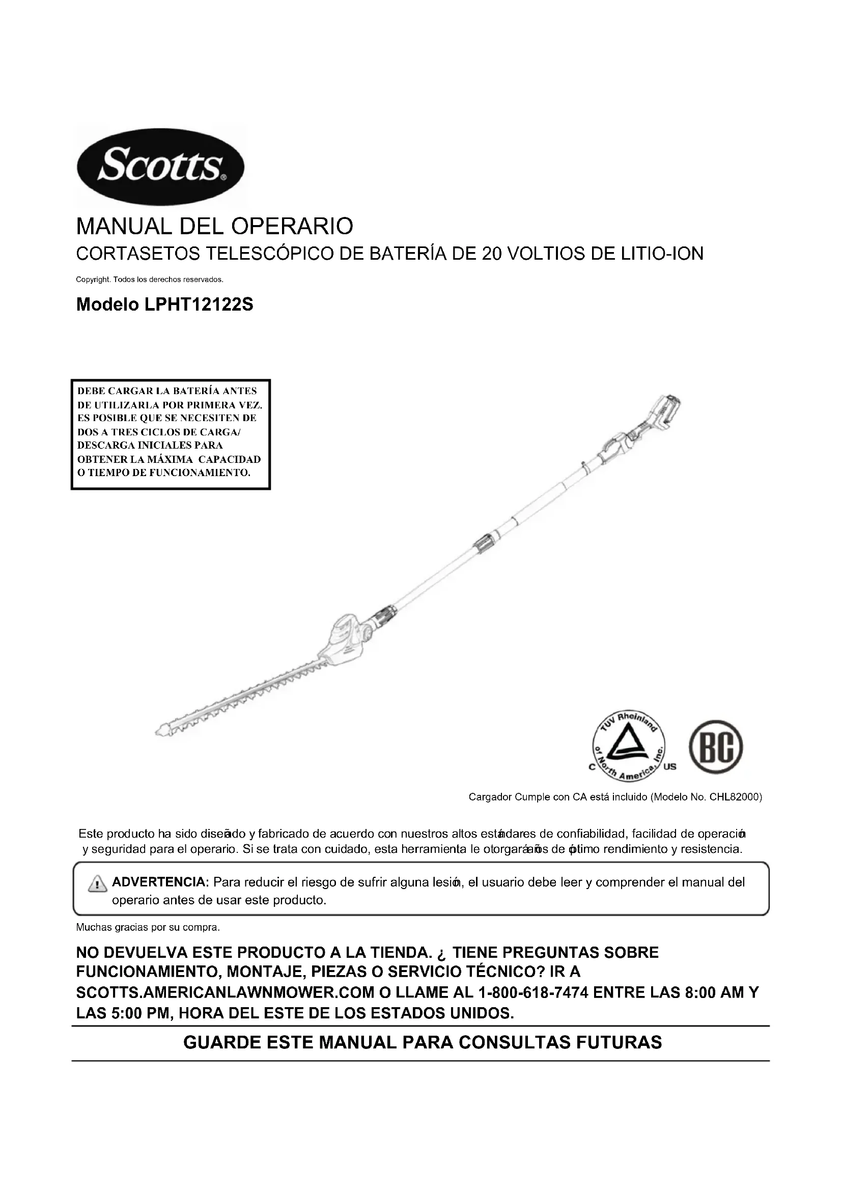 CORTASETOS TELESCÓPICO DE BATERÍA DE 20 VOLTIOS DE LITIO-ION Copyright. Todos los derechos reservados. Modelo LPHT12122S Este producto ha sido diseñado y fabricado de acuerdo con nuestros altos estándares de confiabilidad, facilidad de operación y seguridad para el operario. Si se trata con cuidado, esta herramienta le otorgará años de óptimo rendimiento y resistencia. Muchas gracias por su compra. NO DEVUELVA ESTE PRODUCTO A LA TIENDA. ¿TIENE PREGUNTAS SOBRE FUNCIONAMIENTO, MONTAJE, PIEZAS O SERVICIO TÉCNICO? IR A SCOTTS.AMERICANLAWNMOWER.COM O LLAME AL 1-800-618-7474 ENTRE LAS 8:00 AM Y LAS 5:00 PM, HORA DEL ESTE DE LOS ESTADOS UNIDOS.