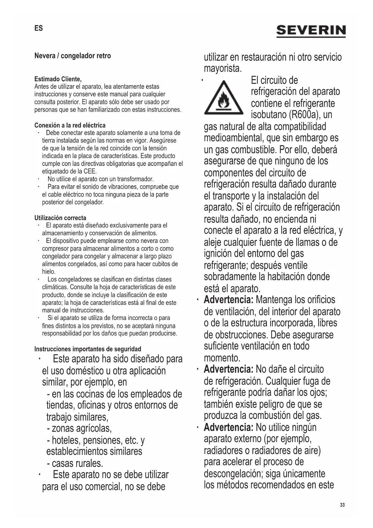 Nevera / congelador retro Estimado Cliente, Antes de utilizar el aparato, lea atentamente estas instrucciones y conserve este manual para cualquier consulta posterior. El aparato sólo debe ser usado por personas que se han familiarizado con estas instrucciones. Conexión a la red eléctrica ∙ Debe conectar este aparato solamente a una toma de tierra instalada según las normas en vigor. Asegúrese de que la tensión de la red coincide con la tensión indicada en la placa de características. Este producto cumple con las directivas obligatorias que acompañan el etiquetado de la CEE. ∙ No utilice el aparato con un transformador. ∙ Para evitar el sonido de vibraciones, compruebe que el cable eléctrico no toca ninguna pieza de la parte posterior del congelador. Utilización correcta ∙ El aparato está diseñado exclusivamente para el almacenamiento y conservación de alimentos. ∙ El dispositivo puede emplearse como nevera con compresor para almacenar alimentos a corto o como congelador para congelar y almacenar a largo plazo alimentos congelados, así como para hacer cubitos de hielo. ∙ Los congeladores se clasican en distintas clases climáticas. Consulte la hoja de características de este producto, donde se incluye la clasicación de este aparato; la hoja de características está al nal de este manual de instrucciones. ∙ Si el aparato se utiliza de forma incorrecta o para nes distintos a los previstos, no se aceptará ninguna responsabilidad por los daños que puedan producirse. Instrucciones importantes de seguridad ∙ Este aparato ha sido diseñado para el uso doméstico u otra aplicación similar, por ejemplo, en - en las cocinas de los empleados de tiendas, ocinas y otros entornos de trabajo similares, - zonas agrícolas, - hoteles, pensiones, etc. y establecimientos similares - casas rurales. ∙ Este aparato no se debe utilizar para el uso comercial, no se debe utilizar en restauración ni otro servicio mayorista.