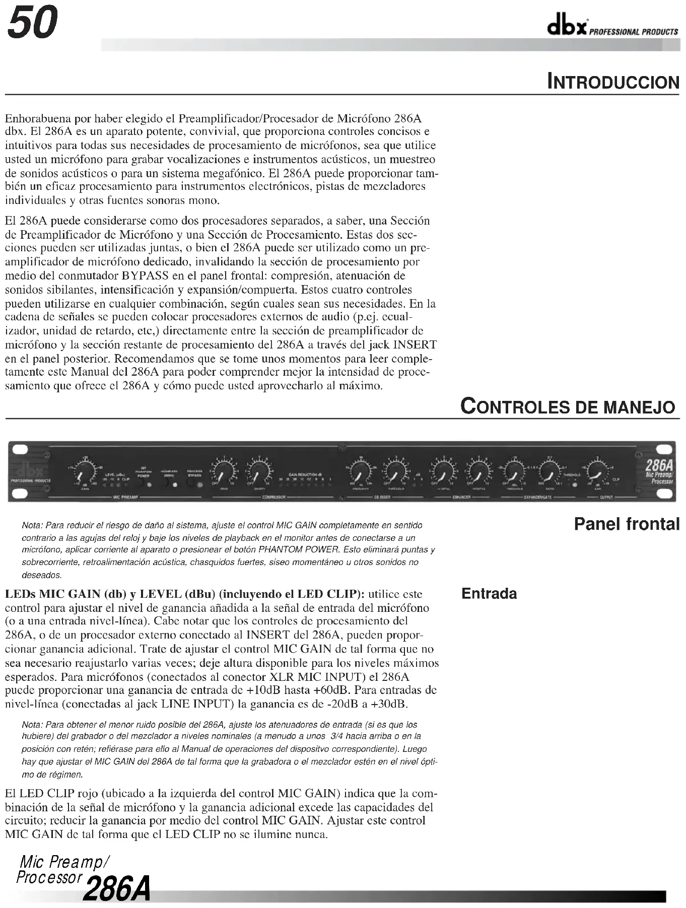 Nombre del fabricante: dbx Professional Products Dirección del fabricante: 8760 S. Sandy Parkway Sandy, Utah 84070, USA declara que el producto: dbx 286A es conforme a las siguientes normas: Seguridad EN 60065 (1993) IEC65 (1985) con enmiendas 1, 2, 3 CEM: EN 55013 (1990) EN 55020 (1991) Información adicional: El producto aquí mencionado cumple con los requisitos de la Directiva 73/23/EEC y la Directiva CEM 89/336/EEC (1989), enmendada por la directiva 93/68/EEC. dbx Professional Products Vice President of Engineering 8760 S. Sandy Parkway Sandy, Utah 84070, USA 4 de octubre, 1996 Contacto en Europa: su oficina dbx de ventas y servico local, o: International Sales Office 68 Sheila Lane Valparaiso, Indiana 46383, USA Tel: (219) 462-0938 Fax: (219) 462-4596Mic Preamp/ Processor 286A