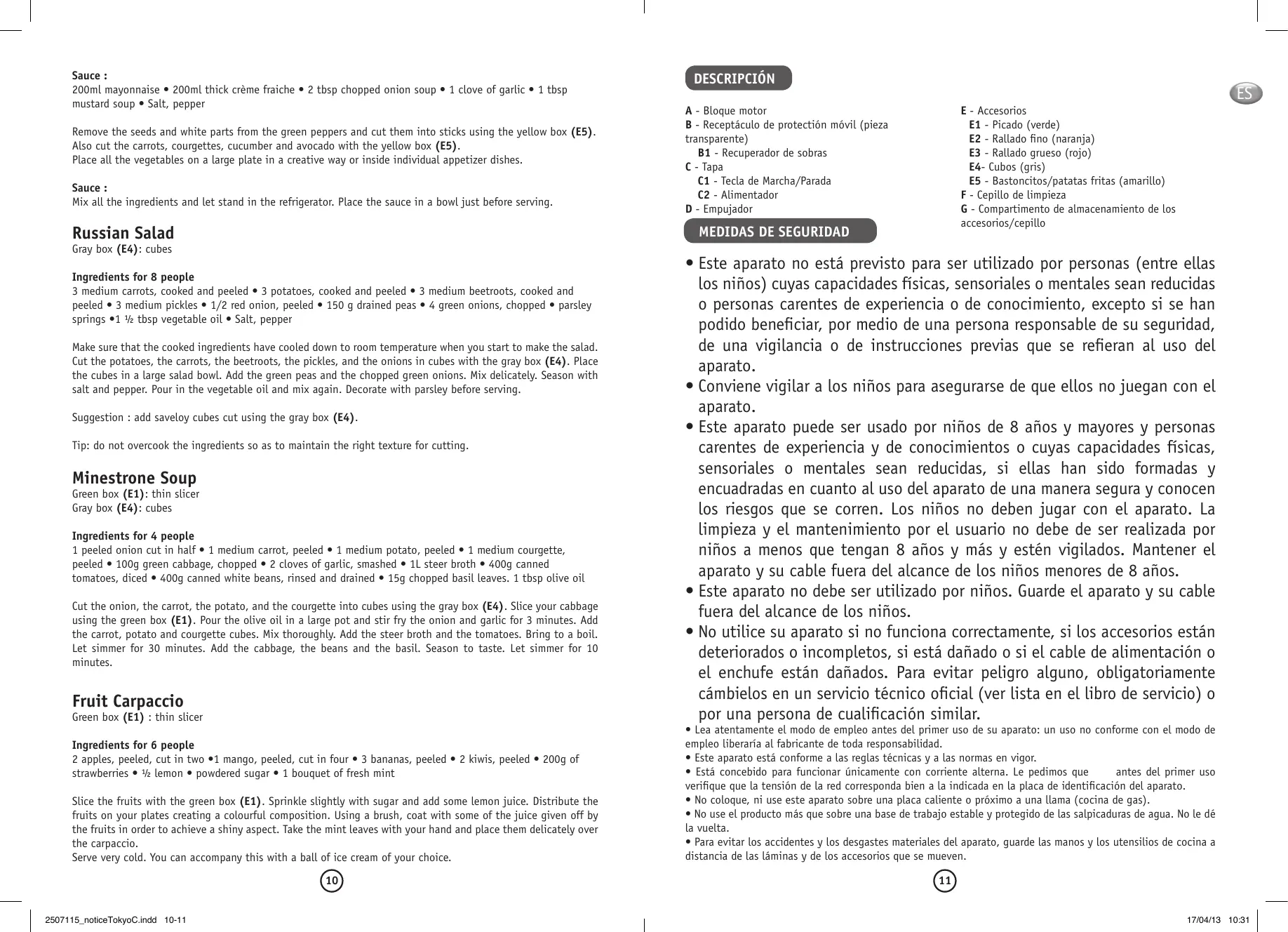 ES E - Accesorios E1 - Picado (verde) E2 - Rallado fino (naranja) E3 - Rallado grueso (rojo) E4- Cubos (gris) E5 - Bastoncitos/patatas fritas (amarillo) F - Cepillo de limpieza G - Compartimento de almacenamiento de los accesorios/cepillo