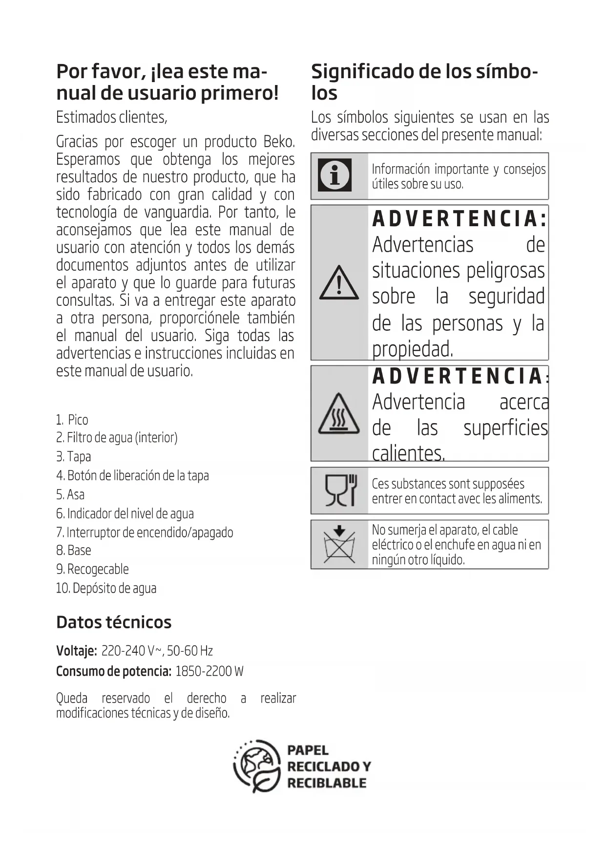- Pendant la manipulation et le transport, portez toujours l’appareil dans son emballage d’origine. L’emballage de l’appareil le protège des dommages physiques. • Ne placez pas de charge lourde sur l’appareil ou sur l’emballage. Cela pourrait l’endommager. • Toute chute de l’appareil peut le rendre non opérationnel ou l’endommager de façon permanente.Pour la mise en service, l’utilisation géné-rale et le nettoyage, veuillez respecter les instruc-tions gurant aux pages 4-5 du présent manuel d’utilisation.Por favor, ¡lea este ma- nual de usuario primero! Estimados clientes, Gracias por escoger un producto Beko. Esperamos que obtenga los mejores resultados de nuestro producto, que ha sido fabricado con gran calidad y con tecnología de vanguardia. Por tanto, le aconsejamos que lea este manual de usuario con atención y todos los demás documentos adjuntos antes de utilizar el aparato y que lo guarde para futuras consultas. Si va a entregar este aparato a otra persona, proporciónele también el manual del usuario. Siga todas las advertencias e instrucciones incluidas en este manual de usuario. 1. Pico2. Filtro de agua (interior)3. Tapa4. Botón de liberación de la tapa5. Asa6. Indicador del nivel de agua7. Interruptor de encendido/apagado8. Base 9. Recogecable10. Depósto de agua Datos técnicos Voltaje: 220-240 V~, 50-60 HzConsumo de potencia: 1850-2200 WQueda reservado el derecho a realizar modificaciones técnicas y de diseño. Significado de los símbo- los Los símbolos siguientes se usan en las diversas secciones del presente manual: