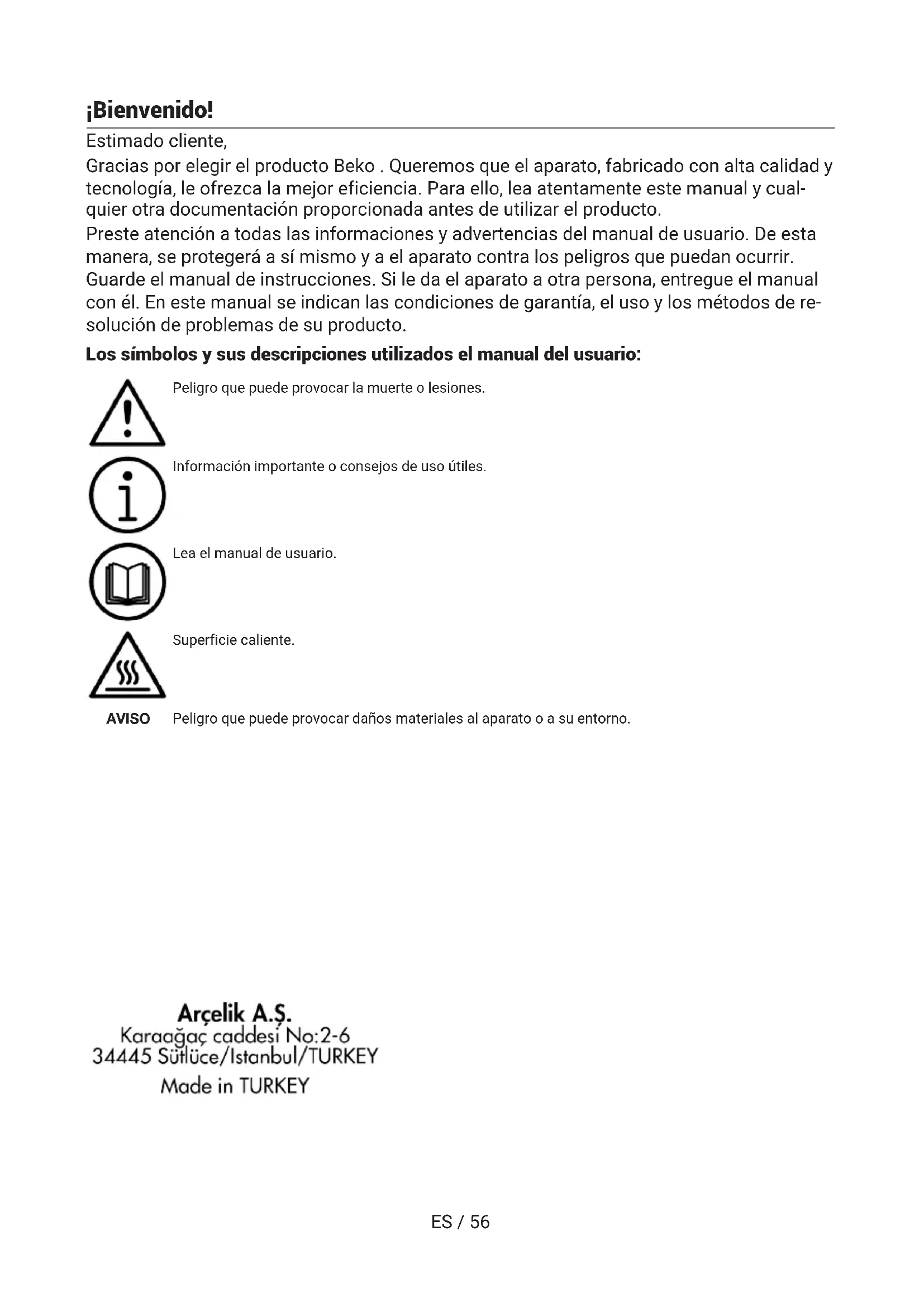 ESES / 56 ¡Bienvenido! Estimado cliente, Gracias por elegir el producto Beko . Queremos que el aparato, fabricado con alta calidad y tecnología, le ofrezca la mejor eficiencia. Para ello, lea atentamente este manual y cual- quier otra documentación proporcionada antes de utilizar el producto. Preste atención a todas las informaciones y advertencias del manual de usuario. De esta manera, se protegerá a sí mismo y a el aparato contra los peligros que puedan ocurrir. Guarde el manual de instrucciones. Si le da el aparato a otra persona, entregue el manual con él. En este manual se indican las condiciones de garantía, el uso y los métodos de re- solución de problemas de su producto. Los símbolos y sus descripciones utilizados el manual del usuario: Peligro que puede provocar la muerte o lesiones. Información importante o consejos de uso útiles. Lea el manual de usuario. Superficie caliente. AVISO Peligro que puede provocar daños materiales al aparato o a su entorno.ES / 57 Tabla de contenidos 1 Instrucciones de Seguridad......... 58