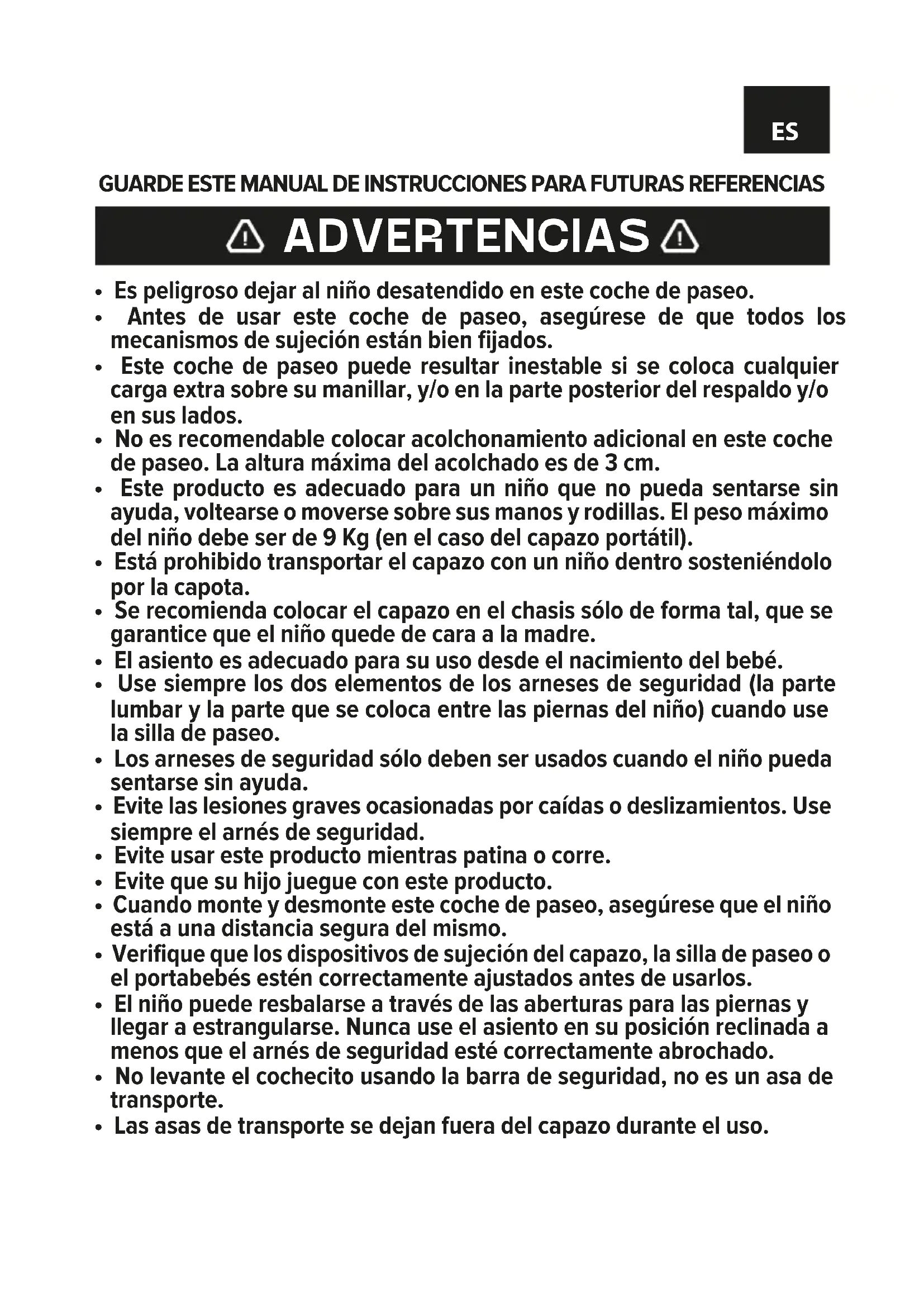 hículo noreemplazar una cuna o una cama. Si su hijo necesita dormir, entonces debería ser colocado en un capazo, cuna o cama adecuados.ES46