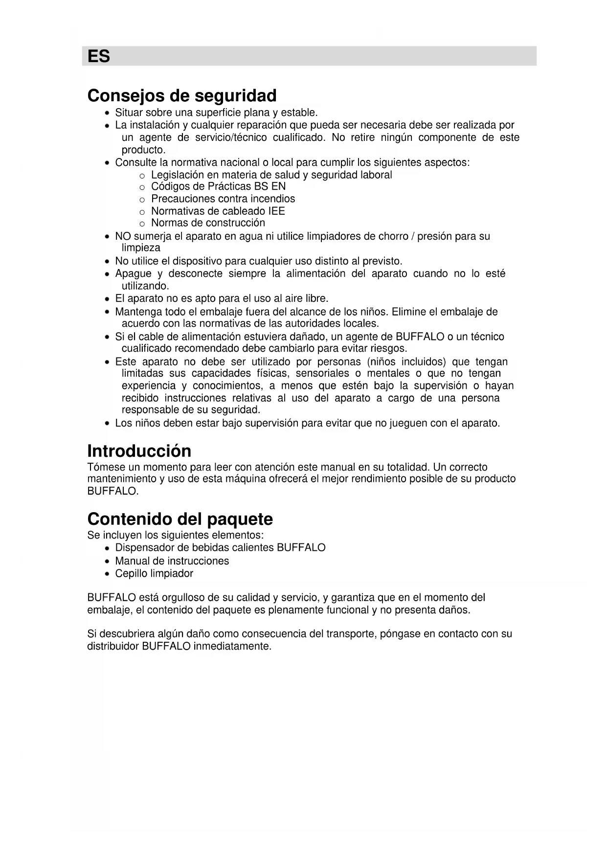 Consejos de seguridad Situar sobre una superficie plana y estable. La instalación y cualquier reparación que pueda ser necesaria debe ser realizada por un agente de servicio/técnico cualificado. No retire ningún componente de este producto. Consulte la normativa nacional o local para cumplir los siguientes aspectos: o Legislación en materia de salud y seguridad laboral o Códigos de Prácticas BS EN o Precauciones contra incendios o Normativas de cableado IEE o Normas de construcción NO sumerja el aparato en agua ni utilice limpiadores de chorro / presión para su limpieza No utilice el dispositivo para cualquier uso distinto al previsto. Apague y desconecte siempre la alimentación del aparato cuando no lo esté utilizando. El aparato no es apto para el uso al aire libre. Mantenga todo el embalaje fuera del alcance de los niños. Elimine el embalaje de acuerdo con las normativas de las autoridades locales. Si el cable de alimentación estuviera dañado, un agente de BUFFALO o un técnico cualificado recomendado debe cambiarlo para evitar riesgos. Este aparato no debe ser utilizado por personas (niños incluidos) que tengan limitadas sus capacidades físicas, sensoriales o mentales o que no tengan experiencia y conocimientos, a menos que estén bajo la supervisión o hayan recibido instrucciones relativas al uso del aparato a cargo de una persona responsable de su seguridad. Los niños deben estar bajo supervisión para evitar que no jueguen con el aparato. Introducción Tómese un momento para leer con atención este manual en su totalidad. Un correcto mantenimiento y uso de esta máquina ofrecerá el mejor rendimiento posible de su producto BUFFALO. Contenido del paquete Se incluyen los siguientes elementos: Dispensador de bebidas calientes BUFFALO Manual de instrucciones Cepillo limpiador BUFFALO está orgulloso de su calidad y servicio, y garantiza que en el momento del embalaje, el contenido del paquete es plenamente funcional y no presenta daños. Si descubriera algún daño como consecuencia del transporte, póngase en contacto con su distribuidor BUFFALO inmediatamente.Línea de asistencia telefónica : 901-100 133 (España)
