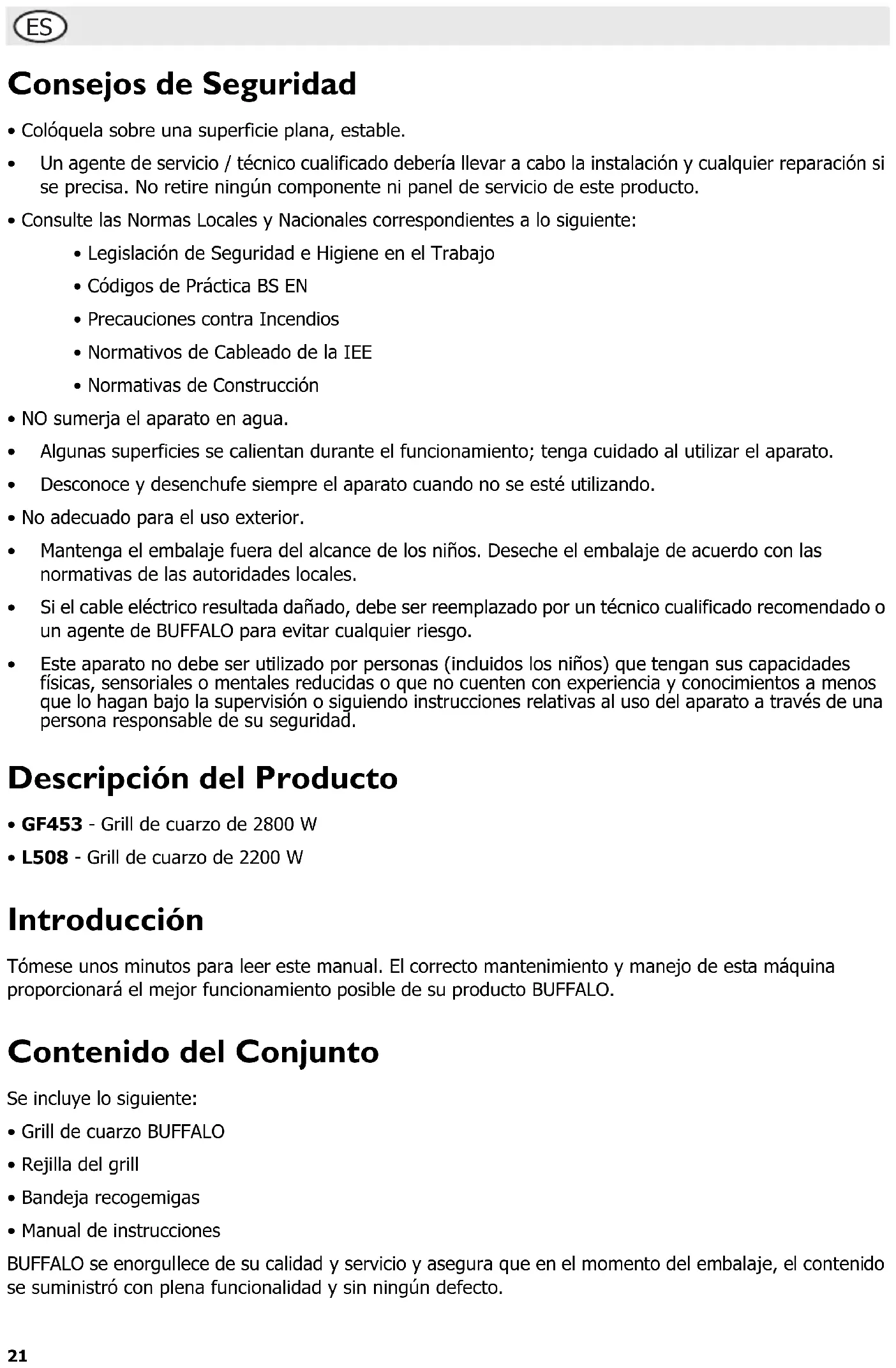 - L508 - Grill de cuarzo de 2200 W Introducción Tómese unos minutos para leer este manual. El correcto mantenimiento y manejo de esta máquina proporcionará el mejor funcionamiento posible de su producto BUFFALO. Contenido del Conjunto Se incluye lo siguiente: