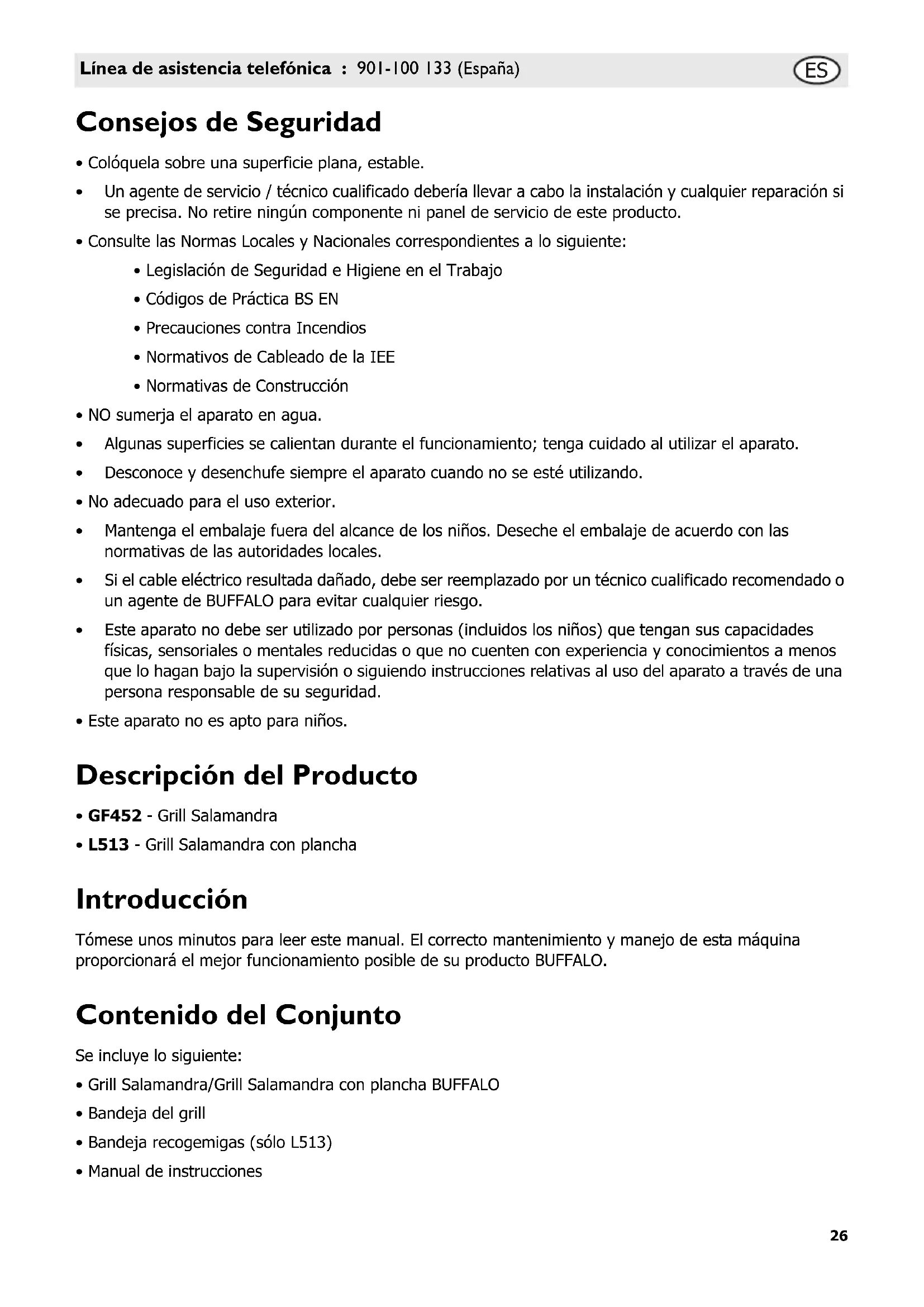 - L513 - Grill Salamandra con plancha Introducción Tómese unos minutos para leer este manual. El correcto mantenimiento y manejo de esta máquina proporcionará el mejor funcionamiento posible de su producto BUFFALO. Contenido del Conjunto Se incluye lo siguiente: