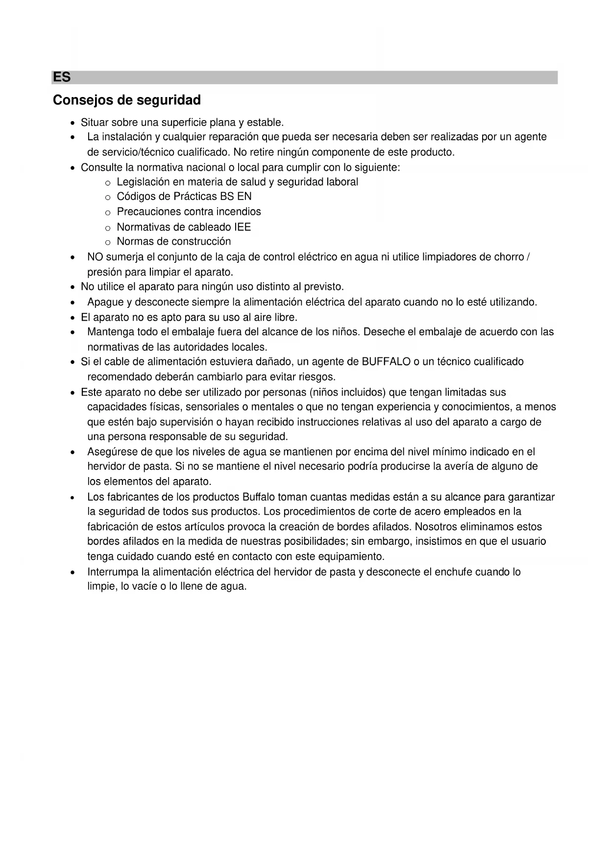 Tutti i diritti riservati. È vietata la riproduzione o la trasmissione in alcuna forma, elettronica, meccanica, mediante fotocopiatura o altro sistema di riproduzione, di qualsiasi parte delle presenti istruzioni senza la previa autorizzazione scritta di BUFFALO. Le informazioni contenute sono corrette e accurate al momento della stampa, tuttavia BUFFALO si riserva il diritto di modificare le specifiche senza preavviso.ES Consejos de seguridad Situar sobre una superficie plana y estable. La instalación y cualquier reparación que pueda ser necesaria deben ser realizadas por un agente de servicio/técnico cualificado. No retire ningún componente de este producto. Consulte la normativa nacional o local para cumplir con lo siguiente: o Legislación en materia de salud y seguridad laboral o Códigos de Prácticas BS EN o Precauciones contra incendios o Normativas de cableado IEE o Normas de construcción NO sumerja el conjunto de la caja de control eléctrico en agua ni utilice limpiadores de chorro / presión para limpiar el aparato. No utilice el aparato para ningún uso distinto al previsto. Apague y desconecte siempre la alimentación eléctrica del aparato cuando no lo esté utilizando. El aparato no es apto para su uso al aire libre. Mantenga todo el embalaje fuera del alcance de los niños. Deseche el embalaje de acuerdo con las normativas de las autoridades locales. Si el cable de alimentación estuviera dañado, un agente de BUFFALO o un técnico cualificado recomendado deberán cambiarlo para evitar riesgos. Este aparato no debe ser utilizado por personas (niños incluidos) que tengan limitadas sus capacidades físicas, sensoriales o mentales o que no tengan experiencia y conocimientos, a menos que estén bajo supervisión o hayan recibido instrucciones relativas al uso del aparato a cargo de una persona responsable de su seguridad. Asegúrese de que los niveles de agua se mantienen por encima del nivel mínimo indicado en el hervidor de pasta. Si no se mantiene el nivel necesario podría producirse la avería de alguno de los elementos del aparato. Los fabricantes de los productos Buffalo toman cuantas medidas están a su alcance para garantizar la seguridad de todos sus productos. Los procedimientos de corte de acero empleados en la fabricación de estos artículos provoca la creación de bordes afilados. Nosotros eliminamos estos bordes afilados en la medida de nuestras posibilidades; sin embargo, insistimos en que el usuario tenga cuidado cuando esté en contacto con este equipamiento. Interrumpa la alimentación eléctrica del hervidor de pasta y desconecte el enchufe cuando lo limpie, lo vacíe o lo llene de agua.Linea de asistencia telefónica: 901-100 133 (Espana) ES Introducción Gracias por comprar el hervidor de pasta eléctrico Buffalo. Antes de poner este producto en funcionamiento, es preciso que lea detenidamente las instrucciones incluidas en este manual. Esto le ayudará a disfrutar de unos resultados excelentes y sin problemas al emplear el producto. Mantenga el manual en un lugar seguro para su futura referencia. Buffalo no aceptará responsabilidad por fallos del producto en caso de que: Las instrucciones de este manual no se hayan seguido correctamente. Personal no cualificado o no autorizado haya realizado ajustes en el hervidor de pasta. No se hayan utilizado piezas de recambio no originales. El hervidor de pasta no se haya manipulado y limpiado correctamente. El hervidor de pasta se haya utilizado para fines diferentes de los previstos.