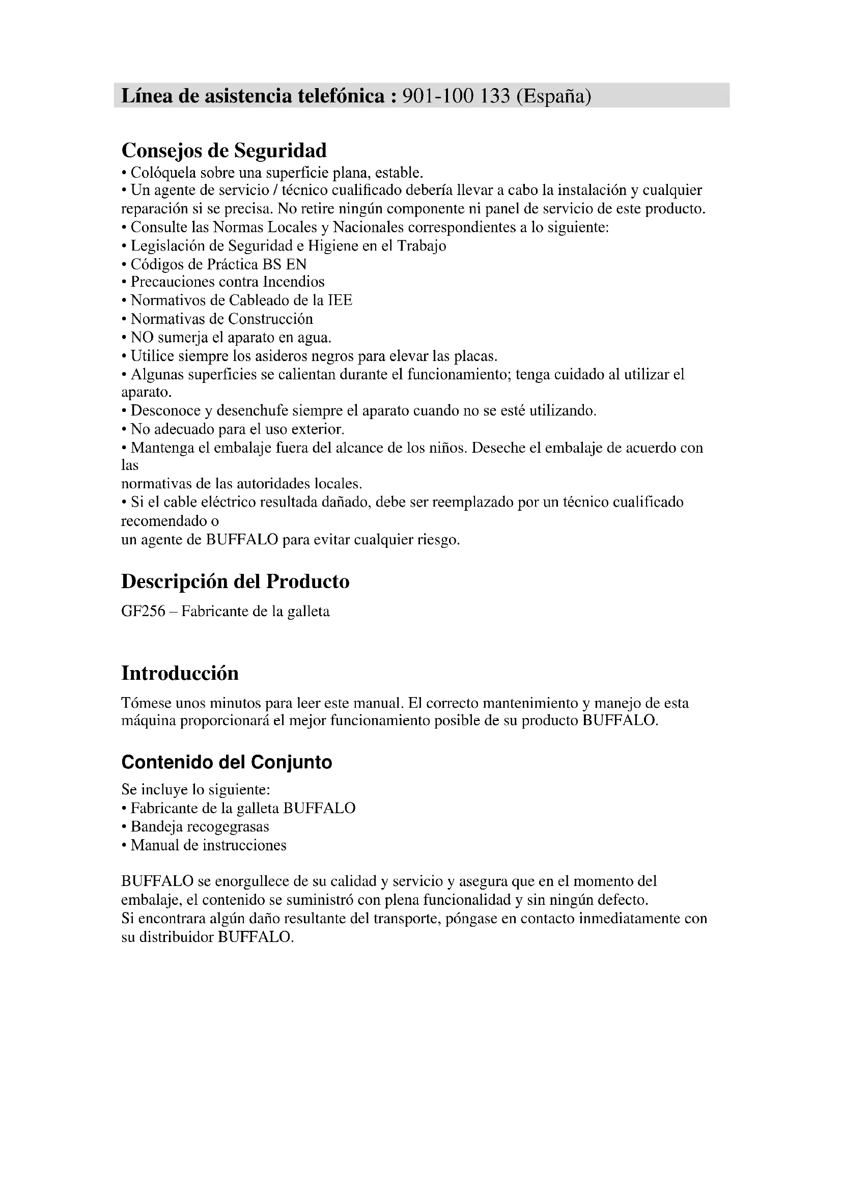 - Si el cable eléctrico resultada dañado, debe ser reemplazado por un técnico cualificado recomendado o un agente de BUFFALO para evitar cualquier riesgo. Descripción del Producto GF256 – Fabricante de la galleta Introducción Tómese unos minutos para leer este manual. El correcto mantenimiento y manejo de esta máquina proporcionará el mejor funcionamiento posible de su producto BUFFALO. Contenido del Conjunto Se incluye lo siguiente: