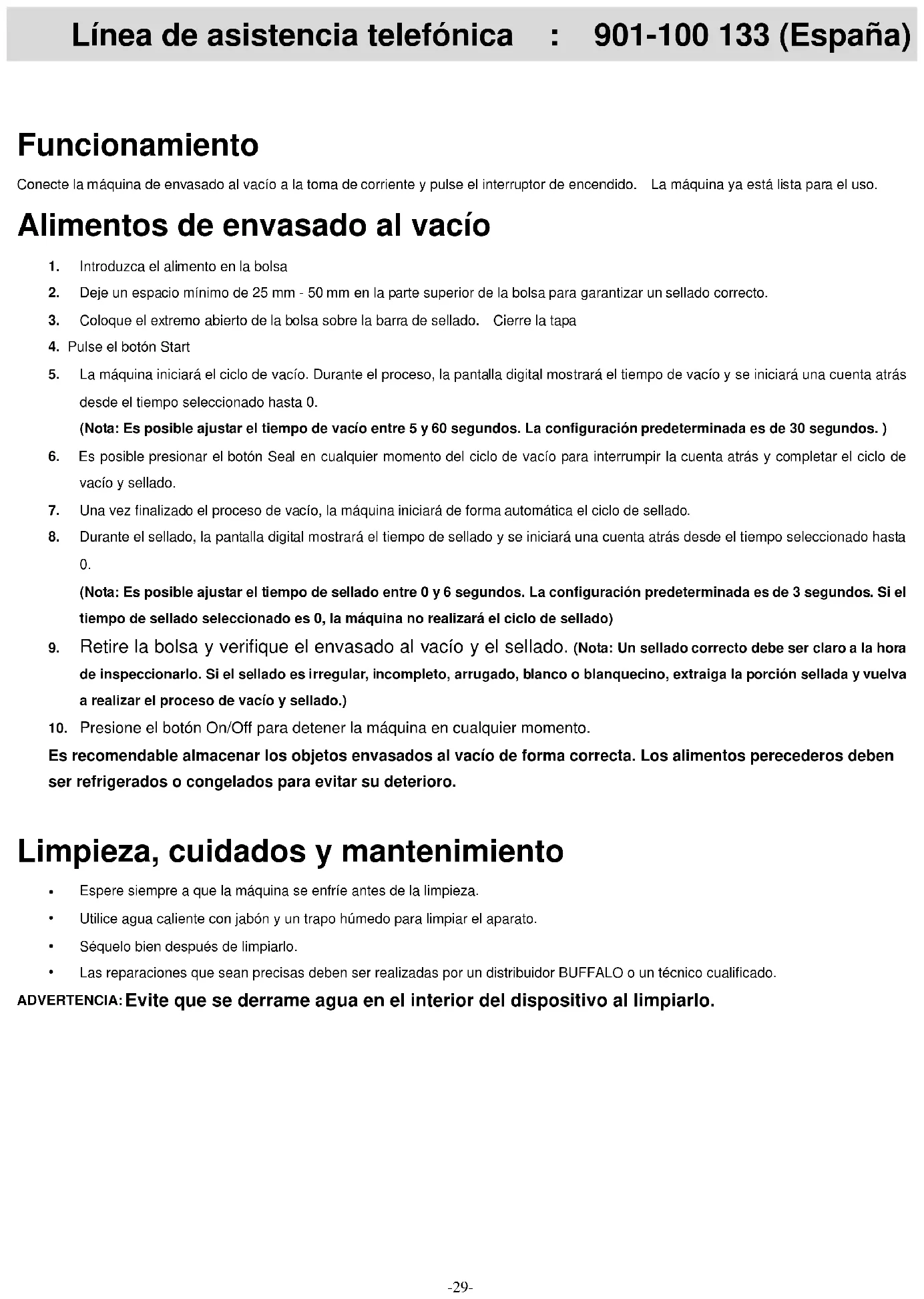 Tutti i diritti riservati. È vietata la riproduzione o la trasmissione in alcuna forma, elettronica, meccanica, mediante fotocopiatura o altro sistema di riproduzione, di qualsiasi parte delle presenti istruzioni senza la previa autorizzazione scritta di BUFFALO. Le informazioni contenute sono corrette e accurate al momento della stampa, tuttavia BUFFALO si riserva il diritto di modificare le specifiche senza preavviso.-27- Línea de asistencia telefónica : 901-100 133 (España) Consejos de seguridad Situar sobre una superficie plana y estable. La instalación y cualquier reparación que pueda ser necesaria debe ser realizada por un agente de servicio/técnico cualificado. No retire ningún componente de este producto. Consulte la normativa nacional o local para cumplir los siguientes aspectos: o Legislación en materia de salud y seguridad laboral o Códigos de Prácticas BS EN o Precauciones contra incendios o Normativas de cableado IEE o Normas de construcción NO sumerja el aparato en agua. La barra de sellado se calienta durante el uso. NO toque la barra de sellado con el aparato en funcionamiento o inmediatamente después del uso. No desenchufe la clavija para detener el funcionamiento; utilice siempre el botón de inicio/parada. No utilice el dispositivo para cualquier uso distinto al previsto. Utilice solo las bolsas recomendadas por el distribuidor/fabricante con el dispositivo. Apague y desconecte siempre la alimentación del aparato cuando no lo esté utilizando. El aparato no es apto para el uso al aire libre. Mantenga todo el embalaje fuera del alcance de los niños. Elimine el embalaje de acuerdo con las normativas de las autoridades locales. Si el cable de alimentación estuviera dañado, un agente de BUFFALO o un técnico cualificado recomendado debe cambiarlo para evitar riesgos. Este aparato no debe ser utilizado por personas (niños incluidos) que tengan limitadas sus capacidades físicas, sensoriales o mentales o que no tengan experiencia y conocimientos, a menos que estén bajo la supervisión o hayan recibido instrucciones relativas al uso del aparato a cargo de una persona responsable de su seguridad. Los niños deben estar bajo supervisión para evitar que no jueguen con el aparato. Introducción Tómese un momento para leer con atención este manual en su totalidad. Un correcto mantenimiento y uso de esta máquina ofrecerá el mejor rendimiento posible de su producto BUFFALO. Contenido del paquete Se incluyen los siguientes elementos: Máquina de envasado al vacío BUFFALO Manual de instrucciones BUFFALO está orgulloso de su calidad y servicio, y garantiza que en el momento del embalaje, el contenido del paquete es plenamente funcional y no presenta daños. Si descubriera algún daño como consecuencia del transporte, póngase en contacto con su distribuidor BUFFALO inmediatamente.-29- Línea de asistencia telefónica : 901-100 133 (España)