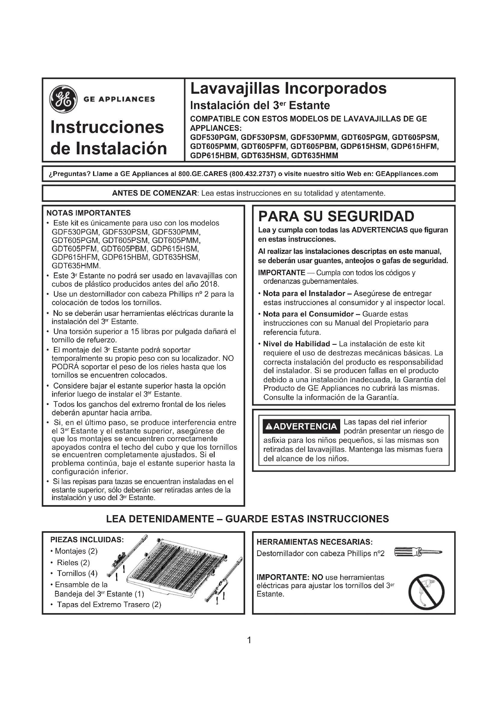 Lea y cumpla con todas las ADVERTENCIAS que figuran en estas instrucciones. Al realizar las instalaciones descriptas en este manual, se deberán usar guantes, anteojos o gafas de seguridad.IMPORTANTE — Cumpla con todos los códigos y ordenanzas gubernamentales.• Nota para el Instalador – Asegúrese de entregar estas instrucciones al consumidor y al inspector local.• Nota para el Consumidor – Guarde estas instrucciones con su Manual del Propietario para referencia futura.• Nivel de Habilidad – La instalación de este kit requiere el uso de destrezas mecánicas básicas. La correcta instalación del producto es responsabilidad del instalador. Si se producen fallas en el producto debido a una instalación inadecuada, la Garantía del Producto de GE Appliances no cubrirá las mismas. Consulte la información de la Garantía.NOTAS IMPORTANTES• Este kit es únicamente para uso con los modelos GDF530PGM, GDF530PSM, GDF530PMM, GDT605PGM, GDT605PSM, GDT605PMM, GDT605PFM, GDT605PBM, GDP615HSM, GDP615HFM, GDP615HBM, GDT635HSM, GDT635HMM.• Este 3 Estante no podrá ser usado en lavavajillas con cubos de plástico producidos antes del año 2018.• Use un destornillador con cabeza Phillips nº 2 para la colocación de todos los tornillos.• No se deberán usar herramientas eléctricas durante la instalación del 3 Estante.• Una torsión superior a 15 libras por pulgada dañará el tornillo de refuerzo.• El montaje del 3 Estante podrá soportar temporalmente su propio peso con su localizador. NO PODRÁ soportar el peso de los rieles hasta que los tornillos se encuentren colocados.• Considere bajar el estante superior hasta la opción inferior luego de instalar el 3 Estante.• Todos los ganchos del extremo frontal de los rieles deberán apuntar hacia arriba.• Si, en el último paso, se produce interferencia entre el 3
