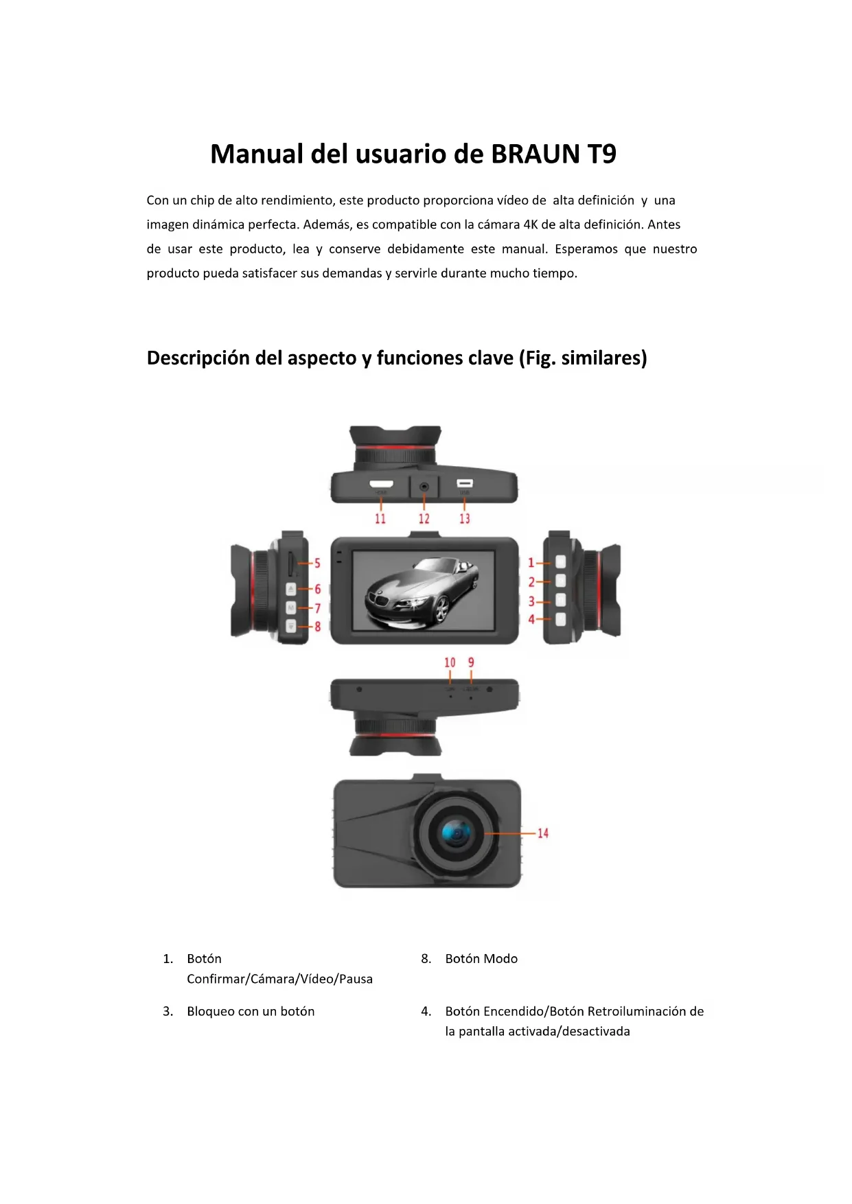 MANUAL DEL USUARIOManual del usuario de BRAUN T9 Con un chip de alto rendimiento, este producto proporciona vídeo de alta definición y una imagen dinámica perfecta. Además, es compatible con la cámara 4K de alta definición. Antes de usar este producto, lea y conserve debidamente este manual. Esperamos que nuestro producto pueda satisfacer sus demandas y servirle durante mucho tiempo. Descripción del aspecto y funciones clave (Fig. similares)