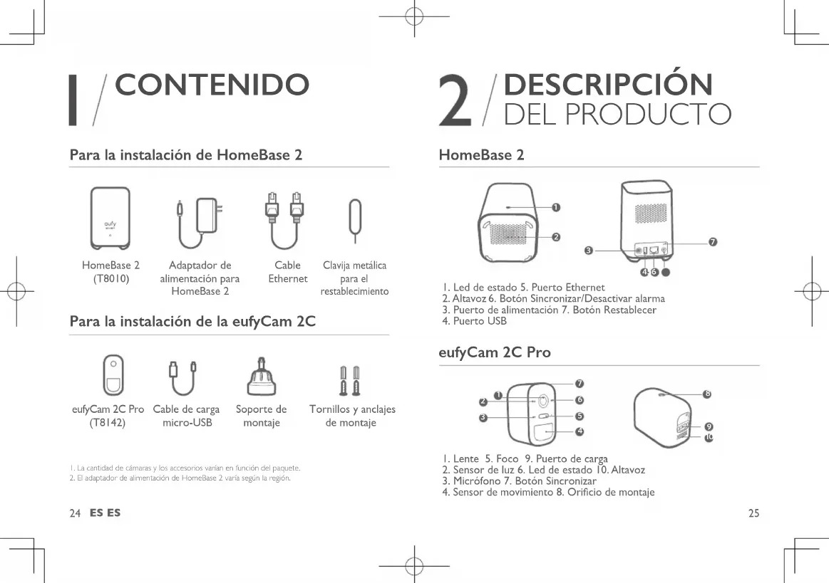 CONTENIDO Para la instalación de HomeBase 2 HomeBase 2 (T8010) Adaptador de alimentación para HomeBase 2 Cable Ethernet Clavija metálica para el restablecimiento Para la instalación de la eufyCam 2C eufyCam 2C Pro (T8142) Cable de carga micro-USB Soporte de montaje Tornillos y anclajes de montaje