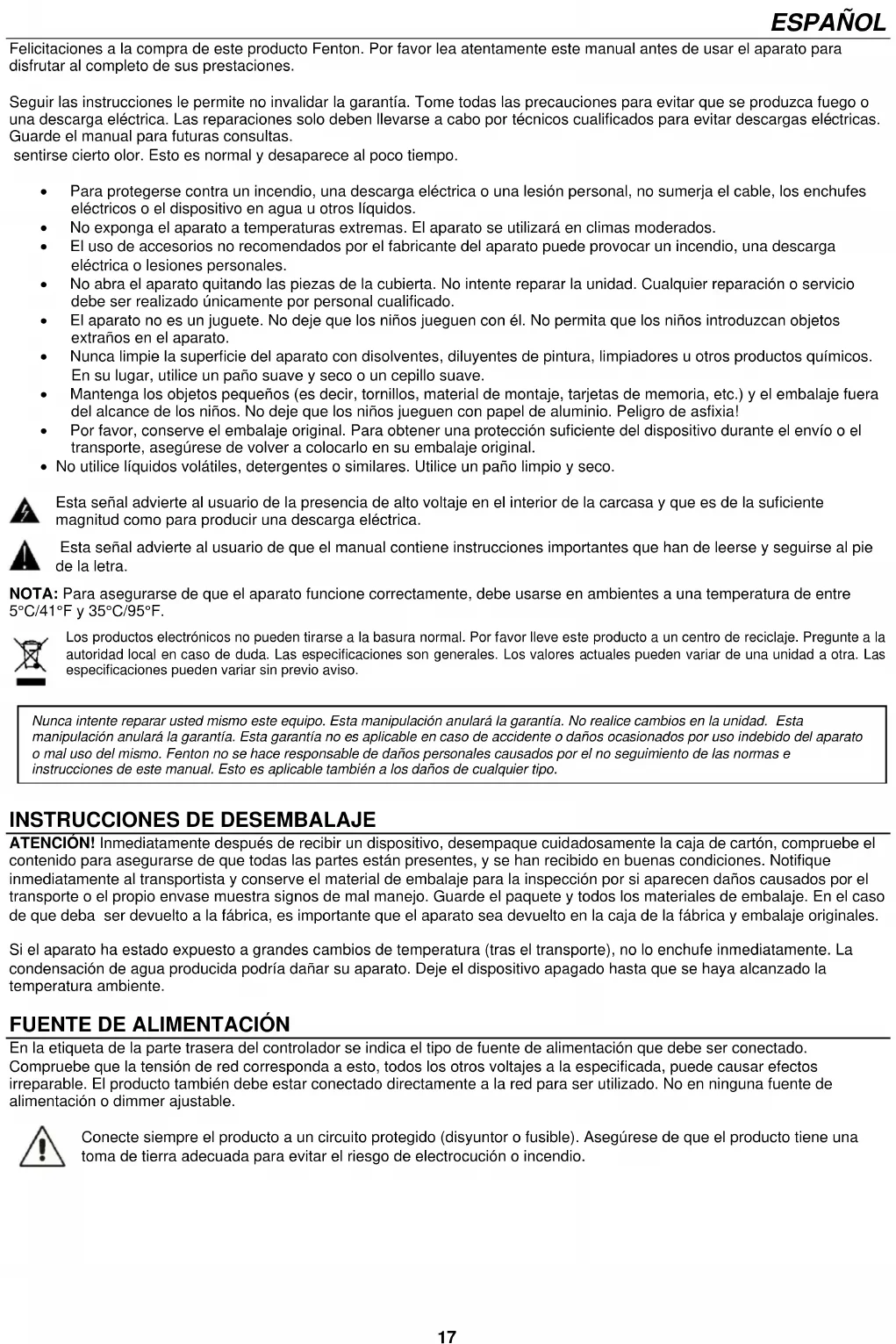 En la etiqueta de la parte trasera del controlador se indica el tipo de fuente de alimentación que debe ser conectado. Compruebe que la tensión de red corresponda a esto, todos los otros voltajes a la especificada, puede causar efectos irreparable. El producto también debe estar conectado directamente a la red para ser utilizado. No en ninguna fuente de alimentación o dimmer ajustable. Conecte siempre el producto a un circuito protegido (disyuntor o fusible). Asegúrese de que el producto tiene una toma de tierra adecuada para evitar el riesgo de electrocución o incendio. Nunca intente reparar usted mismo este equipo. Esta manipulación anulará la garantía. No realice cambios en la unidad. Esta manipulación anulará la garantía. Esta garantía no es aplicable en caso de accidente o daños ocasionados por uso indebido del aparato o mal uso del mismo. Fenton no se hace responsable de daños personales causados por el no seguimiento de las normas e instrucciones de este manual. Esto es aplicable también a los daños de cualquier tipo.18 OPERACIÓN Conectando la unidad Enchufe el adaptador de CA suministrado en el conector de CC en la parte posterior de la unidad y conéctelo a un enchufe de pared de CA estándar con una fuente de alimentación continua de 230V ~ 50Hz. Nota: Cuando la unidad no funciona durante largos períodos de tiempo, desconecte el adaptador de CA de la unidad y de la toma de corriente.