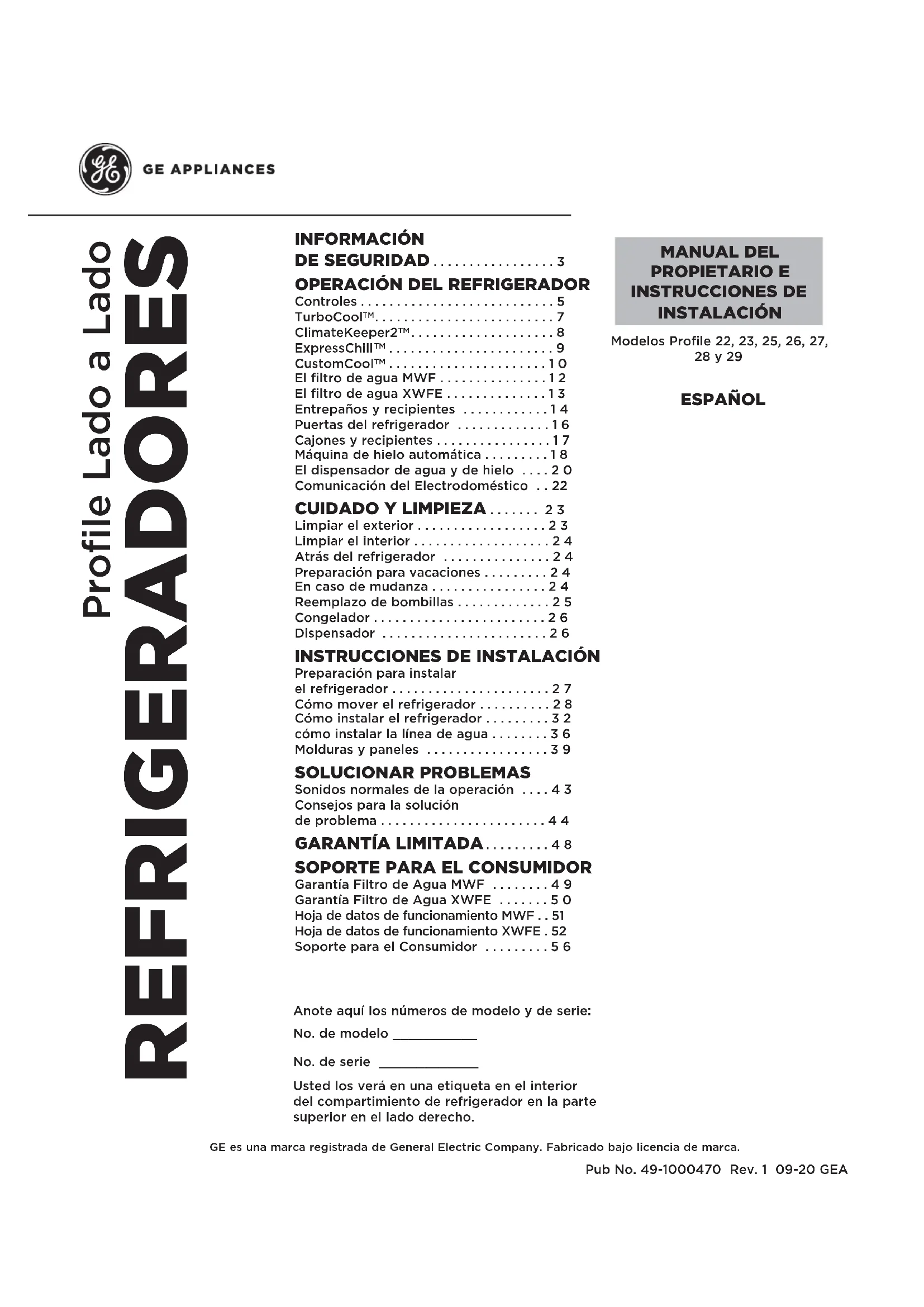 - Hoja de datos de funcionamiento XWFE . 52 Soporte para el Consumidor 49-1000470 Rev. 1 GRACIAS POR HACER QUE GE APPLIANCES SEA PARTE DE SU HOGAR. Ya sea que haya crecido usando GE Appliances, o que ésta es su primera vez, nos complace tenerlo en la familia. Sentimos orgullo por el nivel de arte, innovación y diseño de cada uno de los electrodomésticos de GE Appliances, y creemos que usted también. Entre otras cosas, el registro de su electrodoméstico asegura que podamos entregarle información importante del producto y detalles de la garantía cuando los necesite. Registre su electrodoméstico GE ahora a través de Internet. Sitios Web y números telefónicos útiles están disponibles en la sección de Soporte para el Consumidor de este Manual del Propietario. También puede enviar una carta en la tarjeta de inscripción preimpresa que se incluye con el material embalado.49-1000470 Rev. 1 3 PRECAUCIÓN A fin de reducir el riesgo de lesiones al usar el refrigerador, siga estas precauciones básicas.Ŷ 1ROLPSLHHVWDQWHVGHYLGULRQLWDSDVFRQDJXDFDOLHQWHcuando estén fríos. Los estantes de vidrio y las tapas se pueden romper si son expuestos a cambios de temperatura repentinos o impactos, tales como golpes o caídas. El vidrio templado está diseñado para destruirse en pequeñas piezas en caso de rotura.Ŷ 0DQWHQJDORVGHGRVIXHUDGHORVHVSDFLRVGH³ULHVJRGHlesión”; los espacios entre las puertas y entre las puertas y el gabinete son necesariamente pequeños. Tenga el cuidado de cerrar las puertas cuando los niños se encuentren en el área.Ŷ 1RWRTXHODVVXSHUILFLHVIUtDVGHOFRPSDUWLPLHQWRGHOcongelador cuando las manos estén húmedas o mojadas, ya que la piel se podrá adherir a estas superficies extremadamente frías. Ŷ 1RYXHOYDDFRQJHODUFRPLGDVTXHKD\DQHVWDGRtotalmente congeladas en forma previa.Ŷ (QUHIULJHUDGRUHVFRQPiTXLQDVGHKDFHUKLHORautomáticas, evite el contacto con las partes móviles del mecanismo eyector o con el elemento de calefacción que OLEHUDORVFXERV1RFRORTXHORVGHGRVQLODVPDQRVHQHOmecanismo de la máquina de hielo automática mientras el refrigerador esté enchufado.Ŷ 8VHXQYDVRUREXVWRDOGLVSHQVDUKLHORHQPRGHORVFRQdispensador de hielo). p. 562