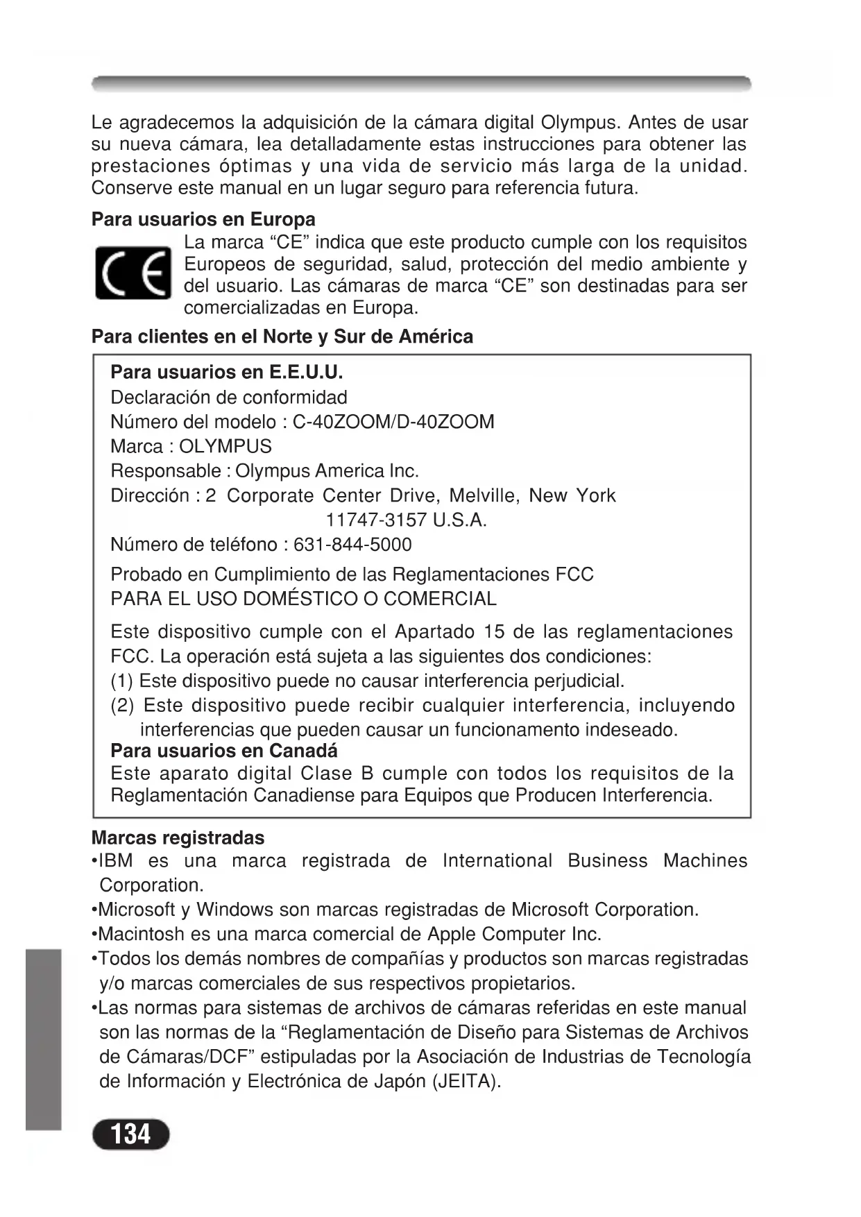 - Las normas para sistemas de archivos de cámaras referidas en este manual son las normas de la “Reglamentación de Diseño para Sistemas de Archivos de Cámaras/DCF” estipuladas por la Asociación de Industrias de Tecnología de Información y Electrónica de Japón (JEITA). Para usuarios en E.E.U.U. Declaración de conformidad Número del modelo : C-40ZOOM/D-40ZOOM Marca : OLYMPUS Responsable : Olympus America Inc. Dirección : 2 Corporate Center Drive, Melville, New York 11747-3157 U.S.A. Número de teléfono : 631-844-5000 Probado en Cumplimiento de las Reglamentaciones FCC PARA EL USO DOMÉSTICO O COMERCIAL Este dispositivo cumple con el Apartado 15 de las reglamentaciones FCC. La operación está sujeta a las siguientes dos condiciones: (1) Este dispositivo puede no causar interferencia perjudicial. (2) Este dispositivo puede recibir cualquier interferencia, incluyendo interferencias que pueden causar un funcionamento indeseado. Para usuarios en Canadá Este aparato digital Clase B cumple con todos los requisitos de la Reglamentación Canadiense para Equipos que Producen Interferencia. Para clientes en el Norte y Sur de América 4 C-4040ZBasic-S134 01.10.11 9:46 AM Page 134135
