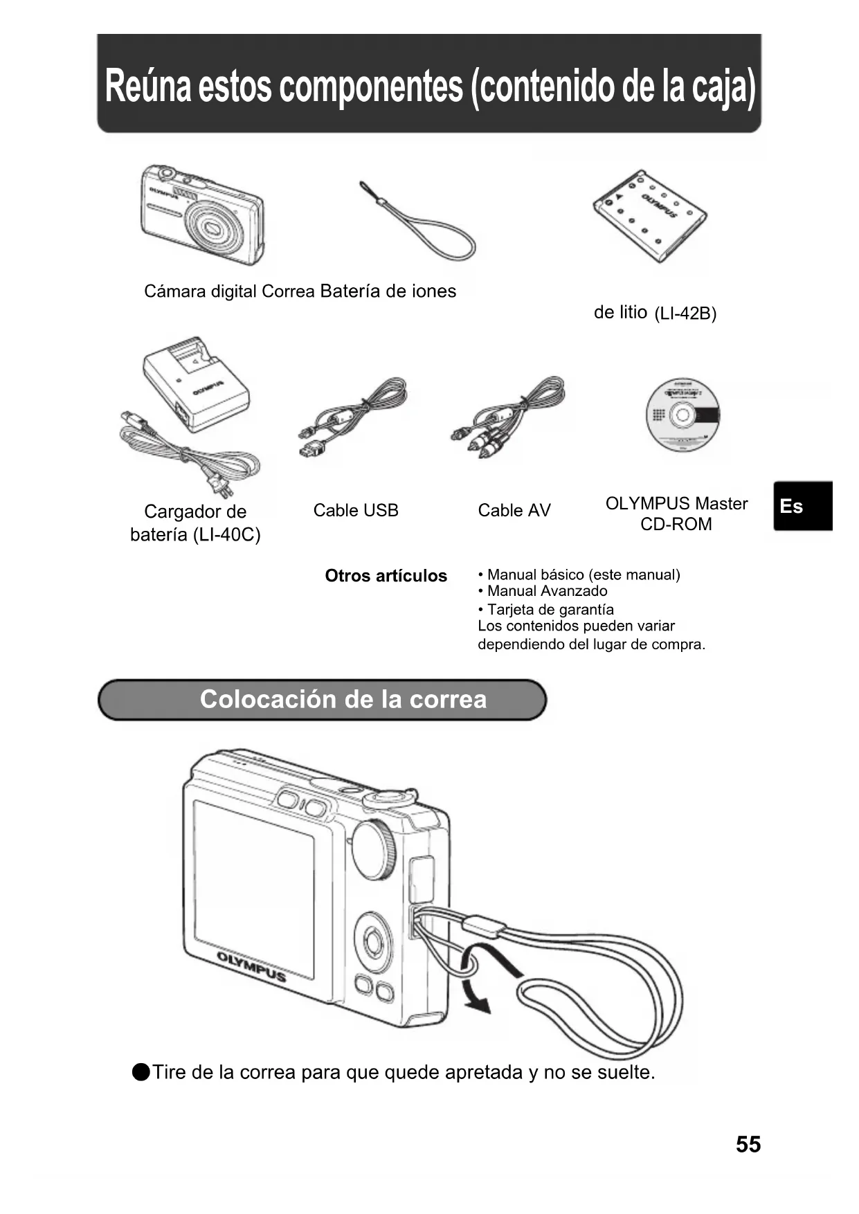 Reúna estos componentes (contenido de la caja) Colocación de la correa ( Tire de la correa para que quede apretada y no se suelte. Otros artículos• Manual básico (este manual)• Manual Avanzado• Tarjeta de garantíaLos contenidos pueden variar dependiendo del lugar de compra.Cámara digital Correa Batería de iones de litio (LI-42B) Cargador de batería (LI-40C) Cable USBOLYMPUS Master CD-ROMCable AV d4337_oai_s_basic_00_bookfile.book Page 55 Wednesday, November 29, 2006 9:53 AM56