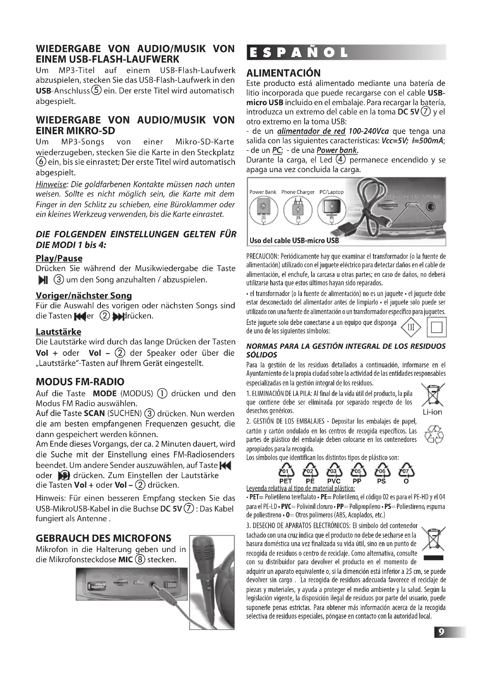 Mikrofon in die Halterung geben und in die Mikrofonsteckdose MIC h stecken. ALIMENTACIÓN Este producto está alimentado mediante una batería de litio incorporada que puede recargarse con el cable USB-micro USB incluido en el embalaje. Para recargar la batería, introduzca un extremo del cable en la toma DC 5V y el otro extremo en la toma USB: - de un alimentador de red 100-240Vca que tenga una salida con las siguientes características: Vcc=5V; I=500mA; - de un PC; - de una Power bank. Durante la carga, el Led permanece encendido y se apaga una vez concluida la carga. PRECAUCION: Periódicamente hay que examinar el transformador (o la fuente de alimentación) utilizado con el juguete eléctrico para detectar daños en el cable de alimentación, el enchufe, la carcasa u otras partes; en caso de daños, no deberá utilizarse hasta que estos últimos hayan sido reparados.• el transformador (o la fuente de alimentación) no es un juguete • el juguete debe estar desconectado del alimentador antes de limpiarlo • el juguete solo puede ser utilizado con una fuente de alimentación o un transformador específico para juguetes.Este juguete solo debe conectarse a un equipo que disponga de uno de los siguientes símbolos:NORMAS PARA LA GESTIÓN INTEGRAL DE LOS RESIDUOS SÓLIDOSPara la gestión de los residuos detallados a continuación, informarse en el Ayuntamiento de la propia ciudad sobre la actividad de las entidades responsables especializadas en la gestión integral de los residuos.1. ELIMINACIÓN DE LA PILA: Al final de la vida útil del producto, la pila que contiene debe ser eliminada por separado respecto de los desechos genéricos. 2. GESTIÓN DE LOS EMBALAJES - Depositar los embalajes de papel, cartón y cartón ondulado en los centros de recogida específicos. Las partes de plástico del embalaje deben colocarse en los contenedores apropiados para la recogida. Los símbolos que identifican los distintos tipos de plástico son:Leyenda relativa al tipo de material plástico: