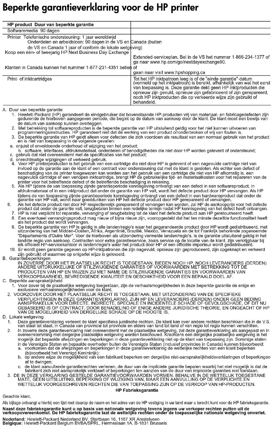 Hewlett-Packard México, S. de R.L. de C.V. Prolongación Reforma No. 700, Col. Lomas de Sta. Fé Delegación Alvaro Obregón CP 91210 México, D.F. Consulte nuestra página Web: www.hp.com/support Centro de Asistencia Telefónica de HP: Ciudad de México: (55) 5258 9922 Para el resto del país: 01 800-474-68368 Para hacer válida su garantía, solo se deberá comunicar al Centro de Asistencia Telefónica de HP y seguir las instrucciones de un representante, quien le indicará el procedimiento a seguir. 3) Los gastos de transportación generados en lugares dentro de la red de servicios de HP en la República Mexicana, para dar cumplimiento a esta garantía, serán cubiertos por Hewlett-Packard. Producto HP Duración de la garantía limitada Medio de almacenamiento del software 90 días Impresora Soporte técnico telefónico: 1 año en todo el mundo Piezas y mano de obra: 90 días en EE.UU. y Canadá (Fuera de EE.UU. y Canadá, 1 año o según la legislación local) Contrate un Plan de servicio ampliado de sustitución el día laborable siguiente HP, de uno o dos años. En EE.UU., llame al 1-866-234-1377 o visite www.hp.com/go/nextdayexchange90. Los clientes de Canadá pueden llamar al 1-877-231-4351 o visitar www.hpshopping.ca Cartuchos de tinta o impresión La garantía es válida hasta que se agote la tinta HP o hasta que se alcance la fecha de “fin de garantía” indicada en el cartucho, cualquiera de los hechos que se produzca en primer lugar. Esta garantía no cubrirá los productos de tinta HP que se hayan rellenado o manipulado, se hayan vuelto a limpiar, se hayan utilizado incorrectamente o se haya alterado su composición. Declaración de garantía limitada de la impresora HPCartucho pretoCartucho colorido