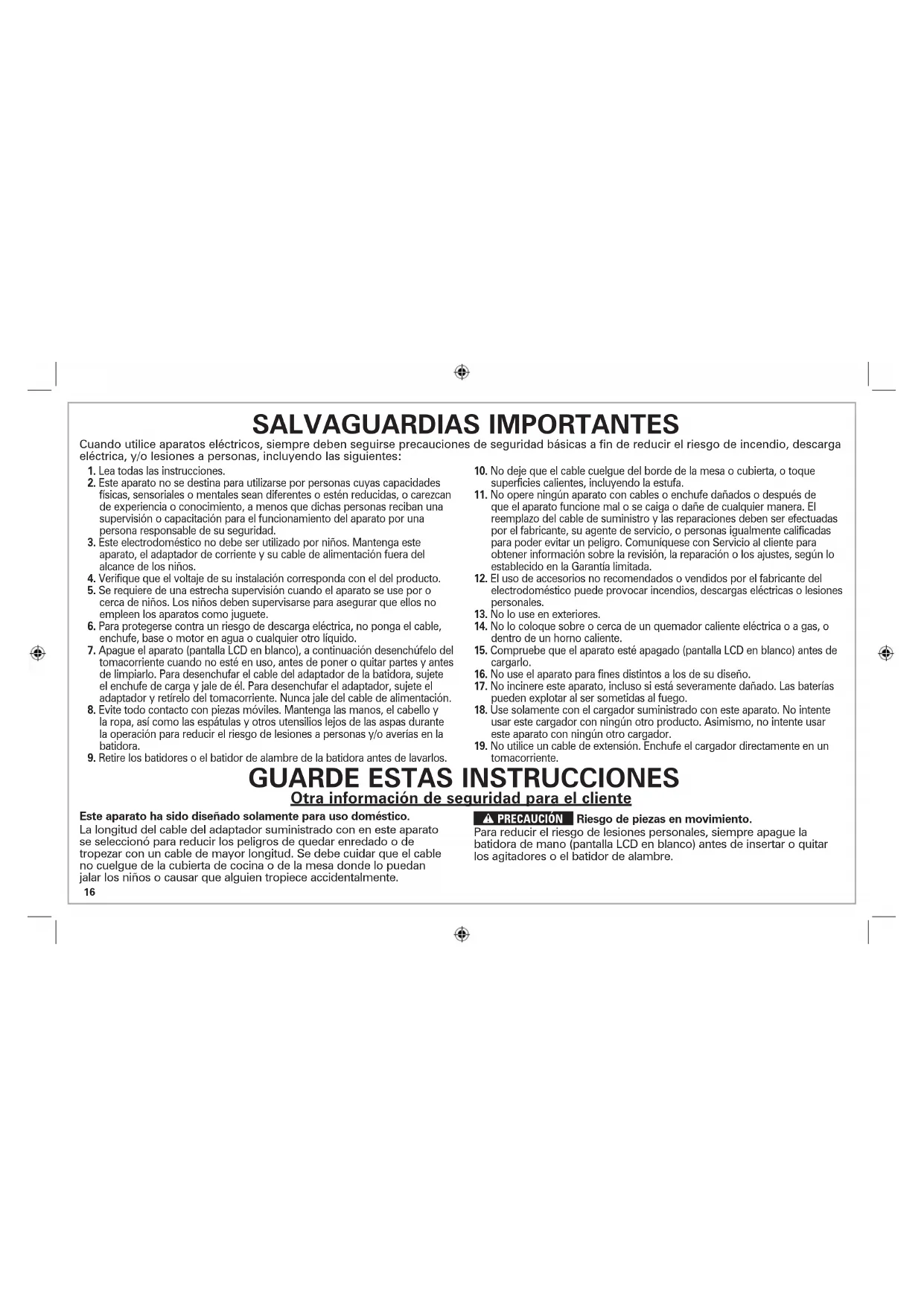 Otra información de seguridad para el cliente Este aparato ha sido diseñado solamente para uso doméstico. La longitud del cable del adaptador suministrado con en este aparato se seleccionó para reducir los peligros de quedar enredado o de tropezar con un cable de mayor longitud. Se debe cuidar que el cable no cuelgue de la cubierta de cocina o de la mesa donde lo puedan jalar los niños o causar que alguien tropiece accidentalmente. w PRECAUCIÓN Riesgo de piezas en movimiento. Para reducir el riesgo de lesiones personales, siempre apague la batidora de mano (pantalla LCD en blanco) antes de insertar o quitar los agitadores o el batidor de alambre.