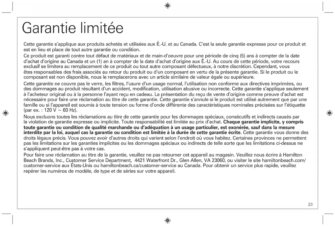 Email: mexico.service@hamiltonbeach.com CENTROS DE SERVICIO AUTORIZADOSModelo: Tipo: Características eléctricas: 49902, 49916, 49934 A147 120 V~ 60 Hz 1400 W Los modelos incluidos en las instrucciones de Uso y cuidado pueden estar seguidos o no de un sufijo correspondiente a una o varias letras y sus combinaciones, separadas o no por un espacio, coma, barra o guión. Ejemplos de los sufijos pueden ser: “Y” y/o “MX” y/o “MXY” y/o “Z”. 840355802 9/22