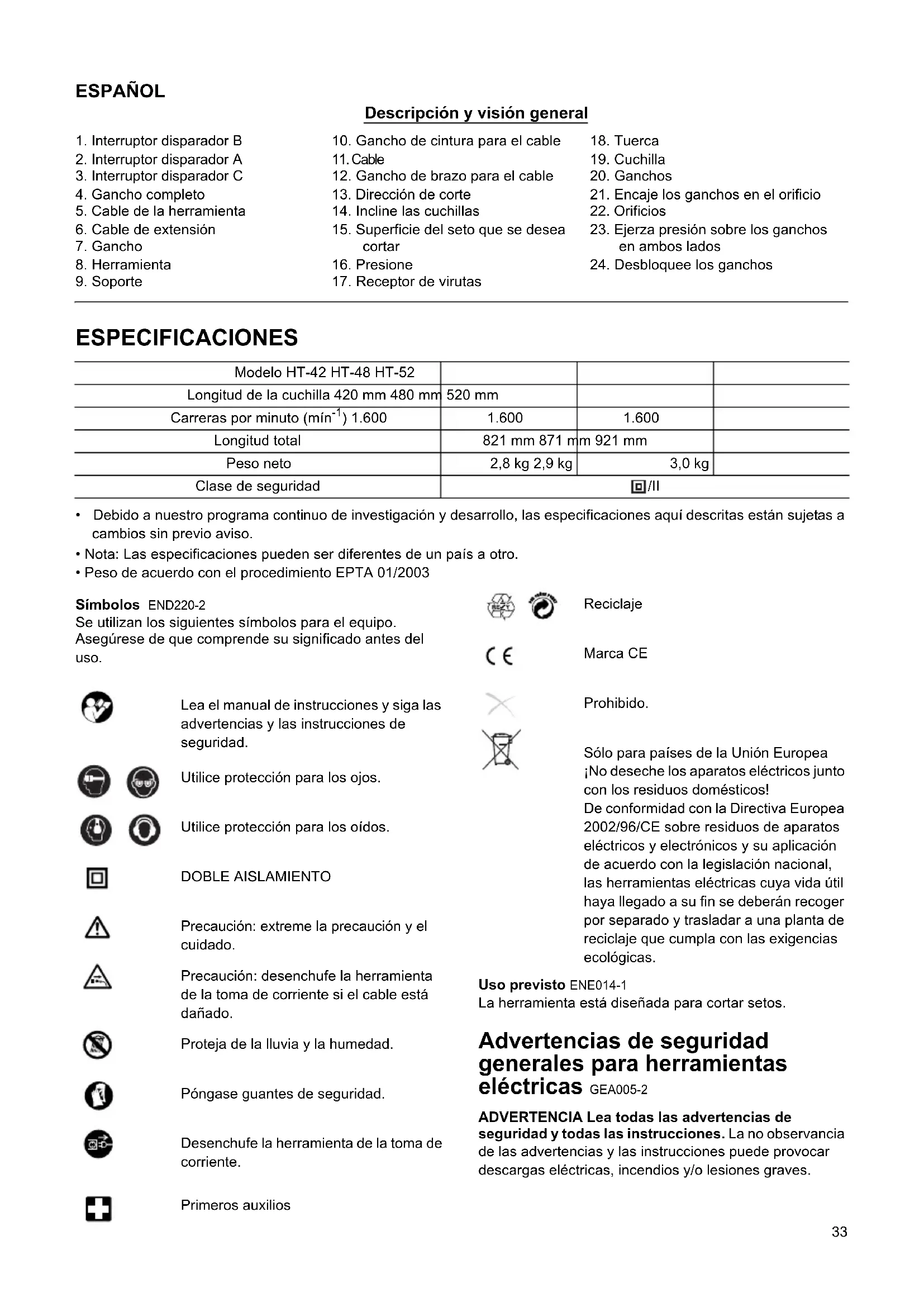 - Peso de acuerdo con el procedimiento EPTA 01/2003 Símbolos END220-2 Se utilizan los siguientes símbolos para el equipo. Asegúrese de que comprende su significado antes del uso. Lea el manual de instrucciones y siga las advertencias y las instrucciones de seguridad. Utilice protección para los ojos. Utilice protección para los oídos. DOBLE AISLAMIENTO Precaución: extreme la precaución y el cuidado. Precaución: desenchufe la herramienta de la toma de corriente si el cable está dañado. Proteja de la lluvia y la humedad. Póngase guantes de seguridad. Desenchufe la herramienta de la toma de corriente. Primeros auxilios Reciclaje Marca CE Prohibido. Sólo para países de la Unión Europea ¡No deseche los aparatos eléctricos junto con los residuos domésticos! De conformidad con la Directiva Europea 2002/96/CE sobre residuos de aparatos eléctricos y electrónicos y su aplicación de acuerdo con la legislación nacional, las herramientas eléctricas cuya vida útil haya llegado a su fin se deberán recoger por separado y trasladar a una planta de reciclaje que cumpla con las exigencias ecológicas. Uso previsto ENE014-1 La herramienta está diseñada para cortar setos. Advertencias de seguridad generales para herramientas eléctricas GEA005-2 ADVERTENCIA Lea todas las advertencias de seguridad y todas las instrucciones. La no observancia de las advertencias y las instrucciones puede provocar descargas eléctricas, incendios y/o lesiones graves.