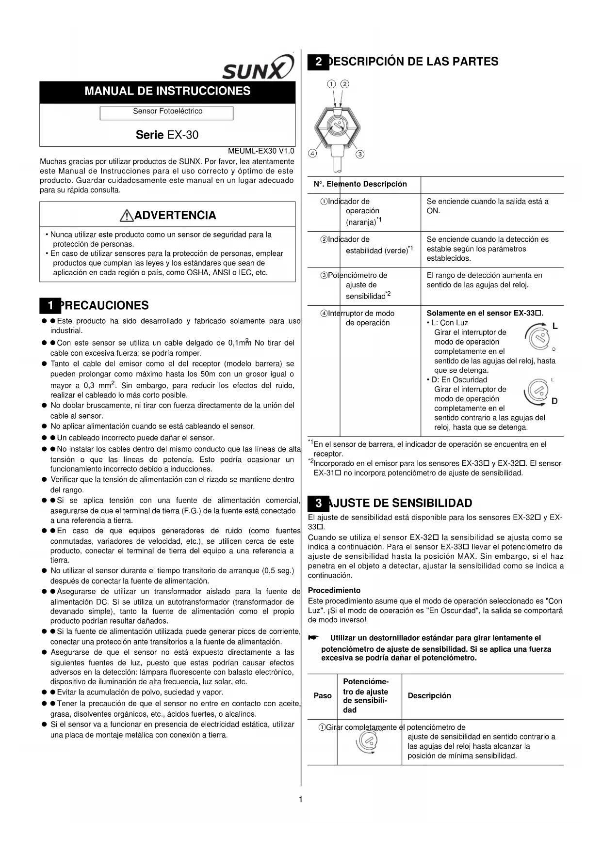 MEUML-EX30 V1.0 Muchas gracias por utilizar productos de SUNX. Por favor, lea atentamente este Manual de Instrucciones para el uso correcto y óptimo de este producto. Guardar cuidadosamente este manual en un lugar adecuado para su rápida consulta. Este producto ha sido desarrollado y fabricado solamente para uso industrial. Con este sensor se utiliza un cable delgado de 0,1mm