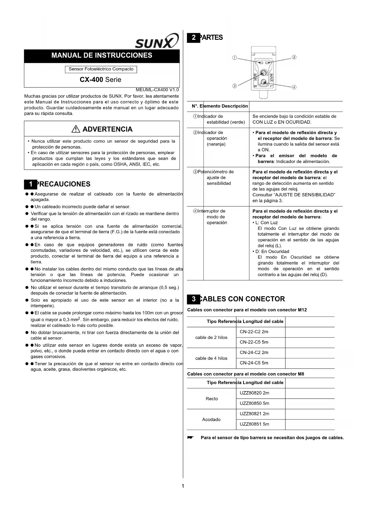 Durch das Anbringen von Interferenzschutzfiltern lassen sich zwei Lichtschranken nah nebeneinander montieren. Nähere Informationen finden Sie auf Seite 4, Abschnitt 10, FILTER ZUM SCHUTZ VOR LICHTINTERFERENZEN.1 MEUML-CX400 V1.0 Muchas gracias por utilizar productos de SUNX. Por favor, lea atentamente este Manual de Instrucciones para el uso correcto y óptimo de este producto. Guardar cuidadosamente este manual en un lugar adecuado para su rápida consulta. Asegurarse de realizar el cableado con la fuente de alimentación apagada. Un cableado incorrecto puede dañar el sensor. Verificar que la tensión de alimentación con el rizado se mantiene dentro del rango. Si se aplica tensión con una fuente de alimentación comercial, asegurarse de que el terminal de tierra (F.G.) de la fuente está conectado a una referencia a tierra. En caso de que equipos generadores de ruido (como fuentes conmutadas, variadores de velocidad, etc.), se utilicen cerca de este producto, conectar el terminal de tierra del equipo a una referencia a tierra. No instalar los cables dentro del mismo conducto que las líneas de alta tensión o que las líneas de potencia. Puede ocasionar un funcionamiento incorrecto debido a induciones. No utilizar el sensor durante el tiempo transitorio de arranque (0,5 seg.) después de conectar la fuente de alimentación. Solo es apropiado el uso de este sensor en el interior (no a la intemperie). El cable se puede prolongar como máximo hasta los 100m con un grosor igual o mayor a 0,3 mm