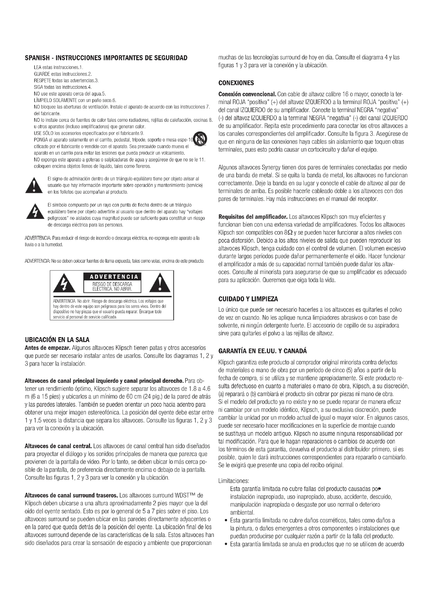 Antes de empezar. Algunos altavoces Klipsch tienen patas y otros accesorios que puede ser necesario instalar antes de usarlos. Consulte los diagramas 1, 2 y 3 para hacer la instalación. Altavoces de canal principal izquierdo y canal principal derecho. Para ob- tener un rendimiento óptimo, Klipsch sugiere separar los altavoces de 1.8 a 4.6 m (6 a 15 pies) y ubicarlos a un mínimo de 60 cm (24 plg.) de la pared de atrás y las paredes laterales. También se pueden orientar un poco hacia adentro para obtener una mejor imagen estereofónica. La posición del oyente debe estar entre 1 y 1.5 veces la distancia que separa los altavoces. Consulte las figuras 1, 2 y 3 para ver la conexión y la ubicación. Altavoces de canal central. Los altavoces de canal central han sido diseñados para proyectar el diálogo y los sonidos principales de manera que parezca que provienen de la pantalla de video. Por lo tanto, se deben ubicar lo más cerca po- sible de la pantalla, de preferencia directamente encima o debajo de la pantalla. Consulte las figuras 1, 2 y 3 para ver la conexión y la ubicación. Altavoces de canal surround traseros. Los altavoces surround WDST™ de Klipsch deben ubicarse a una altura aproximadamente 2 pies mayor que la del oído del oyente sentado. Esto es por lo general de 5 a 7 pies sobre el piso. Los altavoces surround se pueden ubicar en las paredes directamente adyacentes o en la pared que queda detrás de la posición del oyente. La ubicación final de los altavoces surround depende de las características de la sala. Estos altavoces han sido diseñados para crear la sensación de espacio y ambiente que proporcionan muchas de las tecnologías surround de hoy en día. Consulte el diagrama 4 y las figuras 1 y 3 para ver la conexión y la ubicación. CONEXIONES Conexión convencional. Con cable de altavoz calibre 16 o mayor, conecte la ter- minal ROJA “positiva” (+) del altavoz IZQUIERDO a la terminal ROJA “positiva” (+) del canal IZQUIERDO de su amplificador. Conecte la terminal NEGRA “negativa” (-) del altavoz IZQUIERDO a la terminal NEGRA “negativa” (-) del canal IZQUIERDO de su amplificador. Repita este procedimiento para conectar los otros altavoces a los canales correspondientes del amplificador. Consulte la figura 3. Asegúrese de que en ninguna de las conexiones haya cables sin aislamiento que toquen otras terminales, pues esto podría causar un cortocircuito y dañar el equipo. Algunos altavoces Synergy tienen dos pares de terminales conectadas por medio de una banda de metal. Si se quita la banda de metal, los altavoces no funcionan correctamente. Deje la banda en su lugar y conecte el cable de altavoz al par de terminales de arriba. Es posible hacerle cableado doble a los altavoces con dos pares de terminales. Hay más instrucciones en el manual del receptor. Requisitos del amplificador. Los altavoces Klipsch son muy eficientes y funcionan bien con una extensa variedad de amplificadores. Todos los altavoces Klipsch son compatibles con 8Ω y se pueden hacer funcionar a altos niveles con poca distorsión. Debido a los altos niveles de salida que pueden reproducir los altavoces Klipsch, tenga cuidado con el control de volumen. El volumen excesivo durante largos períodos puede dañar permanentemente el oído. Hacer funcionar el amplificador a más de su capacidad normal también puede dañar los altav- oces. Consulte al minorista para asegurarse de que su amplificador es adecuado para su aplicación. Queremos que oiga toda la vida.