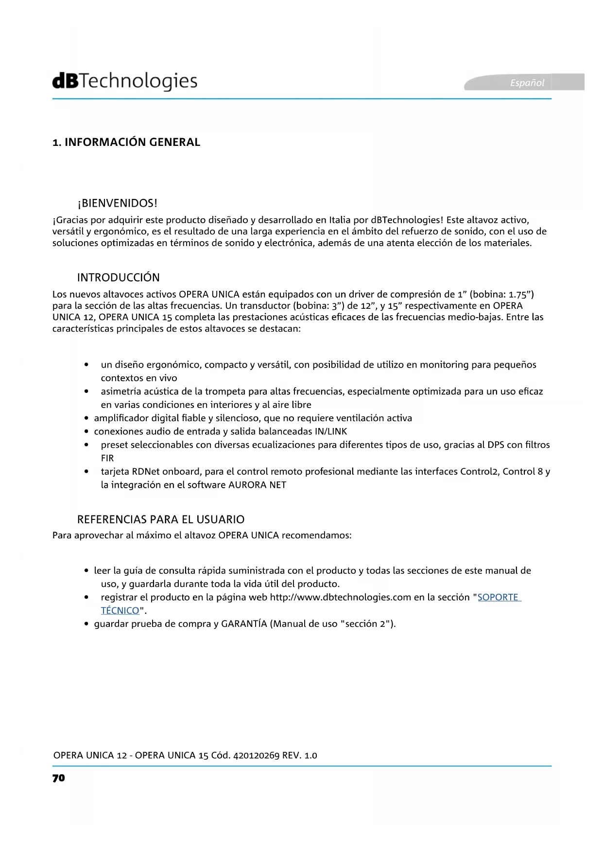 ¡Gracias por adquirir este producto diseñado y desarrollado en Italia por dBTechnologies! Este altavoz activo, versátil y ergonómico, es el resultado de una larga experiencia en el ámbito del refuerzo de sonido, con el uso de soluciones optimizadas en términos de sonido y electrónica, además de una atenta elección de los materiales. Los nuevos altavoces activos OPERA UNICA están equipados con un driver de compresión de 1” (bobina: 1.75”) para la sección de las altas frecuencias. Un transductor (bobina: 3”) de 12”, y 15” respectivamente en OPERA UNICA 12, OPERA UNICA 15 completa las prestaciones acústicas ecaces de las frecuencias medio-bajas. Entre las características principales de estos altavoces se destacan: Para aprovechar al máximo el altavoz OPERA UNICA recomendamos: