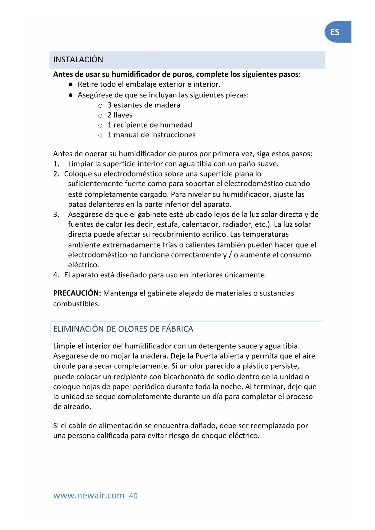 PRECAUCIÓN: Mantenga el gabinete alejado de materiales o sustancias combustibles. ELIMINACIÓN DE OLORES DE FÁBRICA Limpie el interior del humidificador con un detergente sauce y agua tibia. Asegurese de no mojar la madera. Deje la Puerta abierta y permita que el aire circule para secar completamente. Si un olor parecido a plástico persiste, puede colocar un recipiente con bicarbonato de sodio dentro de la unidad o coloque hojas de papel periódico durante toda la noche. Al terminar, deje que la unidad se seque completamente durante un día para completar el proceso de aireado. Si el cable de alimentación se encuentra dañado, debe ser reemplazado por una persona calificada para evitar riesgo de choque eléctrico.ES