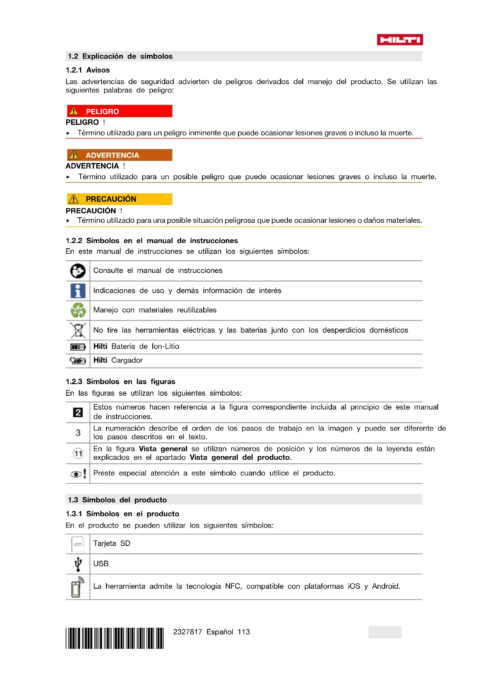 En el producto se pueden utilizar los siguientes símbolos: Tarjeta SD USB La herramienta admite la tecnología NFC, compatible con plataformas iOS y Android.114 Español 2327817 *2327817* Serie utilizada de baterías de Ion-Litio Hilti. Consulte las indicaciones recogidas en el capítulo Uso conforme a las prescripciones. Batería de Ion-Litio Advertencia de piezas pequeñas que pueden tragarse (pilas de botón) Si está en el producto, significa que el organismo de certificación lo ha certificado para el merca- do estadounidense y canadiense según las normas vigentes.