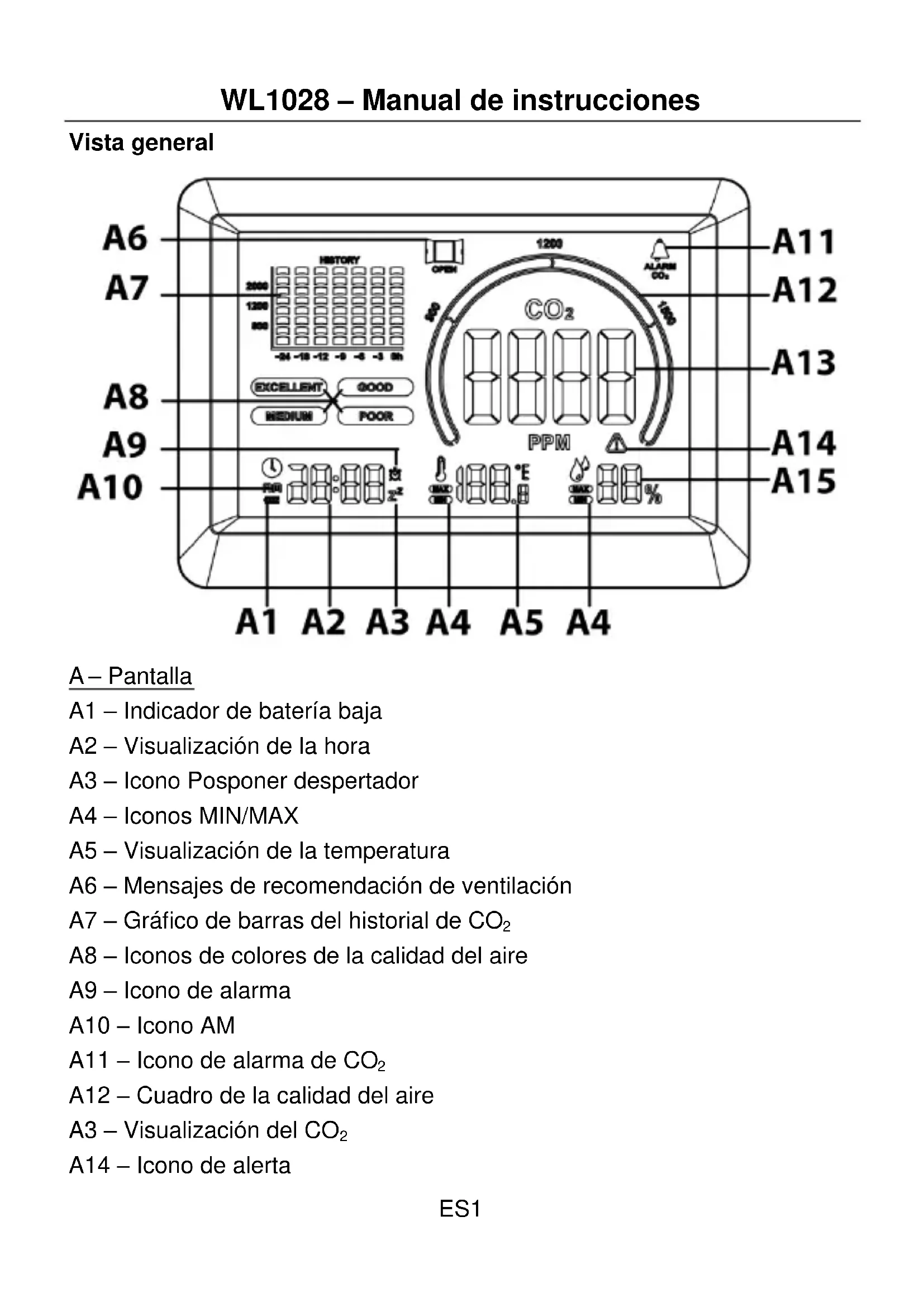 Rango de medición : 400 – 5000 ppm Resolución : 1 ppm Precisión : +/- 8% + 80 PPM (para 400 a 2000 PPM) Tiempo de calentamiento : 60 segundos Frecuencia de detección : 5 segundosES12 Temperatura Rango de medición : -9,9 °C a 49,9 °C/14 °F a 122 °F Resolución : 0,1 °C / 0,1 °F Precisión : +/- 1,5 °C/ 2,7 °F Frecuencia de detección : 5 segundos Humedad relativa Rango de medición : 1 %-99 % Resolución : 1 % Precisión : +/-5% para 40% ~ 80%; +/-8% RH fuera de este rango Frecuencia de detección : 5 segundos Temperatura de funcionamiento : de 0 °C a 50 °C (32 °F a 122 °F), < 95 % HR sin condensación Visualización fuera de rango CO2 : 400 (menos de 400 ppm) / HI (más de 5000 ppm) Temperatura : LO (por debajo de -10 °C/32 °F) / HI (por encima de 50 °C/122 °F) HR % : 20 % (menos del 20 %) / 95 % (más del 95 %) Alimentación : Cable USB (incluido) que admite Carga de 5,0 V CC 600 mA. (adaptador no incluido). PrecaucionesES13 Este aparato está diseñado para ser utilizado en interiores. No someta el artículo a una fuerza excesiva ni a golpes. No exponga el artículo a temperaturas extremas, luz solar directa, polvo o humedad. No la sumerja en el agua. Evite que entre en contacto con materiales corrosivos. No arroje este artículo al fuego, ya que puede explotar. No abra la carcasa trasera interior ni altere ningún componente de este artículo. ¡Use el producto únicamente para la finalidad prevista! Consideración de obligaciones según las leyes sobre dispositivos electrónicos Este símbolo indica que no debe desechar los dispositivos eléctricos junto con la basura general del hogar cuando llegan al final de su vida útil. Lleve su artículo a su punto de recogida de residuos o su centro de reciclaje local. Esto es de aplicación en todos los países de la Unión Europea y en otros países no europeos con sistema de recogida selectiva de basuras.NL1 WL1028 – Gebruikshandleiding Overzicht A – Display A1 – Indicator lege batterij A2 – Tijdsweergave A3 – Sluimerpictogram A4 – MIN/MAX-pictogrammen A5 – Temperatuurweergave A6 – Pictogram voor ventilatieadvies A7 – Historisch CO