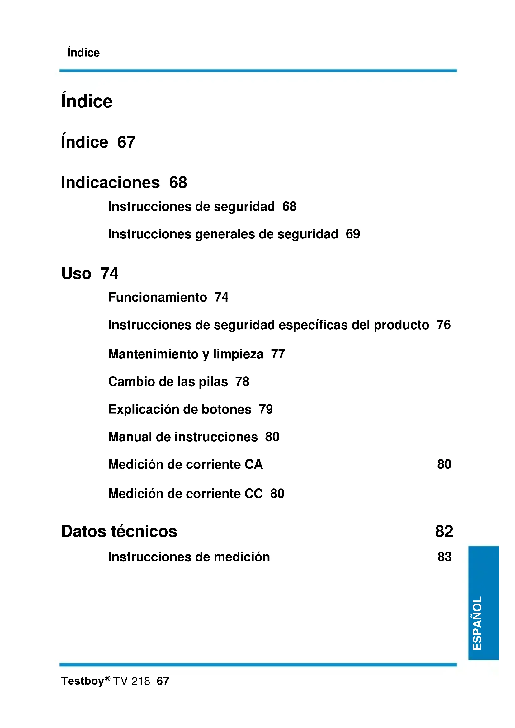 TV 218 67 DEUTSCH DEUTSCH ESPAÑOL Índice Índice 67 Indicaciones 68 Instrucciones de seguridad 68 Instrucciones generales de seguridad 69 Uso 74 Funcionamiento 74 Instrucciones de seguridad específicas del producto 76 Mantenimiento y limpieza 77 Cambio de las pilas 78 Explicación de botones 79 Manual de instrucciones 80 Medición de corriente CA 80 Medición de corriente CC 80 Datos técnicos 82 Instrucciones de medición 83Indicaciones