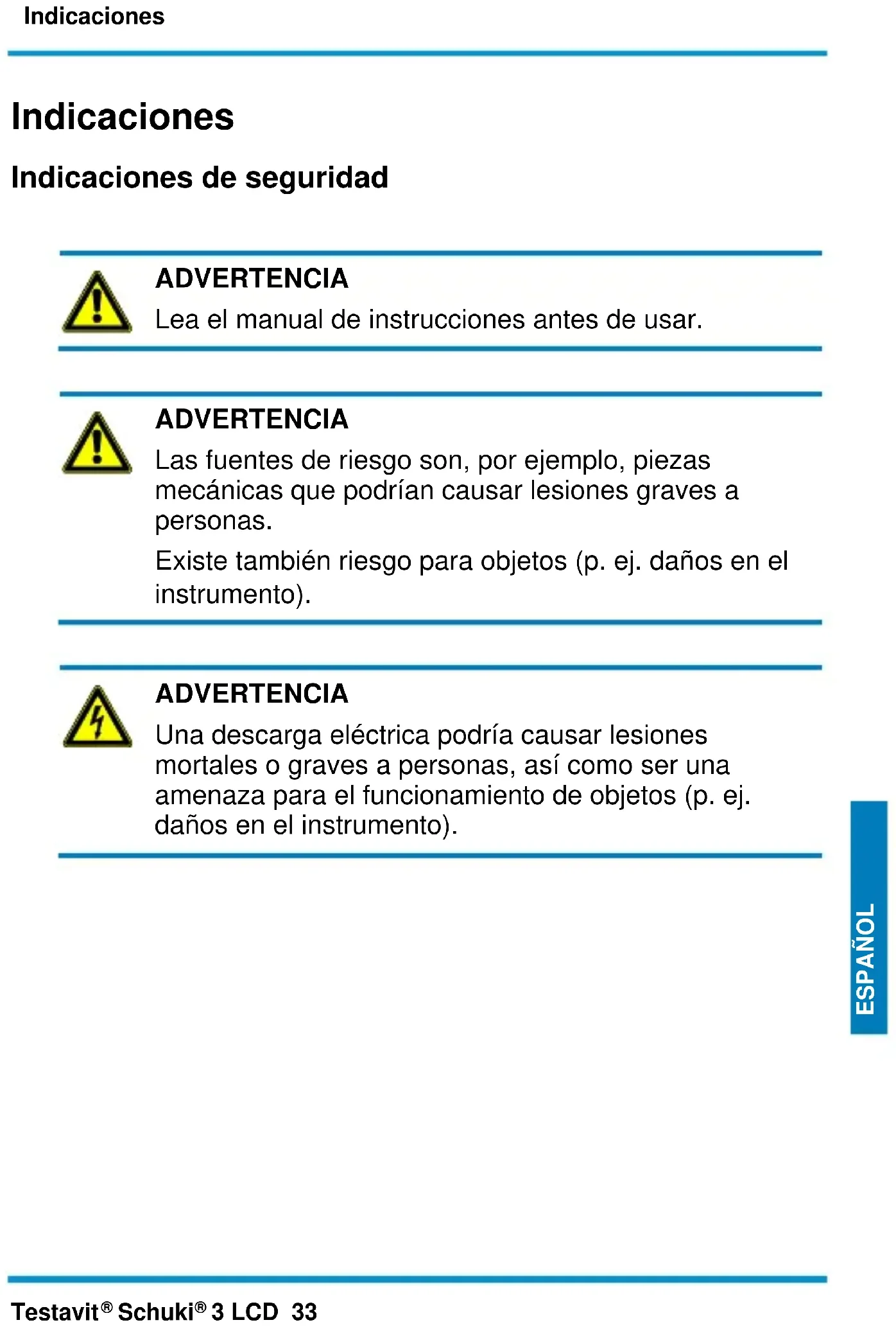 ADVERTENCIA Una descarga eléctrica podría causar lesiones mortales o graves a personas, así como ser una amenaza para el funcionamiento de objetos (p. ej. daños en el instrumento).Indicaciones 34 Testavit