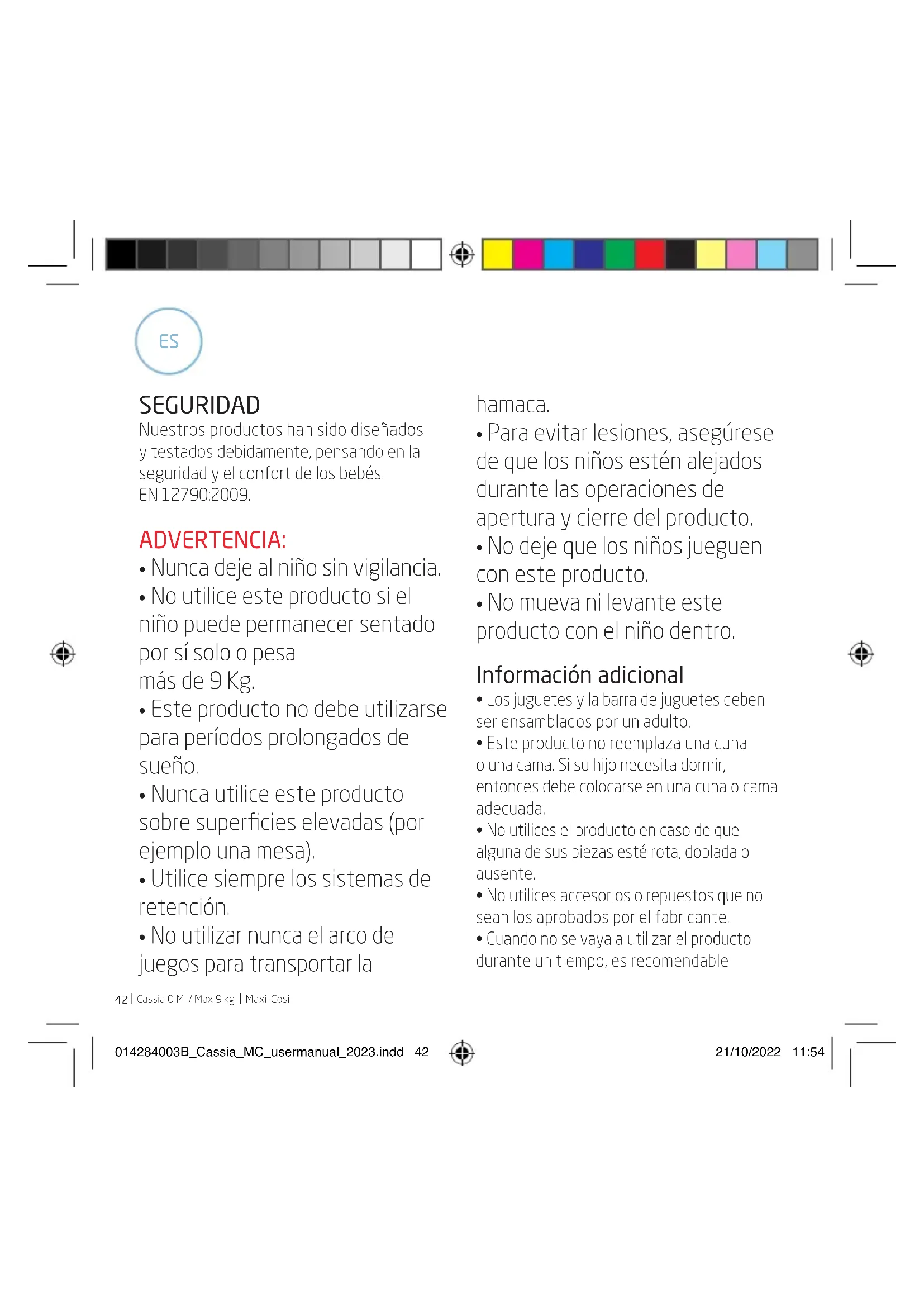 Maxi-Cosi SEGURIDAD Nuestros productos han sido diseñados y testados debidamente, pensando en la seguridad y el confort de los bebés. EN 12790:2009. ADVERTENCIA: