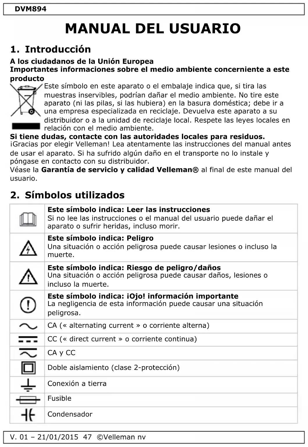 Descarga las instrucciones para tu Multímetro en formato PDF gratis! Encuentra tus instrucciones DVM894 - VELLEMAN y toma tu dispositivo electrónico nuevamente en la mano. En esta página están publicados todos los documentos necesarios para el uso de su dispositivo. DVM894 de la marca VELLEMAN.