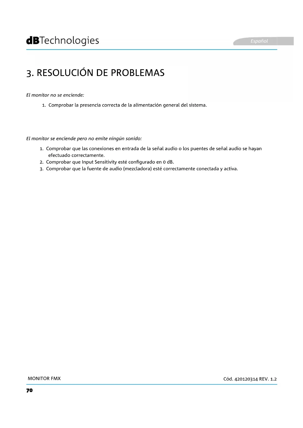 El monitor no se enciende:71 MONITOR FMX Cód. 420120314 REV. 1.2 Controlador interior: DSP 28/56 bit 48 kHz Limitador: Peak, RMS, Térmico PROCESADOR Clase de amplicación: Clase D Potencia de amplicación (Pico) 800 W [10] - 1200 W [12-15] Potencia de amplicación (RMS): 400 W [10] - 600 W [12-15] Técnica de refrigeración: Convección Respuesta en frecuencia [- 6 dB]: 65 - 16.5 kHz [10] / 56 - 15.5 kHz [12] / 50 - 15.5 kHz [15] Respuesta en frecuencia [- 10 dB]: 57 - 19 kHz [10] / 52 - 19 kHz [12] / 46 - 19 kHz [15] Máx. SPL (1 m): 125 dB [10] / 128 dB [12-15] HF: 1” (V.C.: 1”) [10] / 1” (V.C.: 1.3”) [12-15] - LF: 10” - 12” - 15” (V.C.: 2”) Frecuencia de crossover: 1800 Hz [10] - 1740 Hz [12-15] Cobertura: 60° x 90° Tipo: Monitor coaxial activo GENERAL