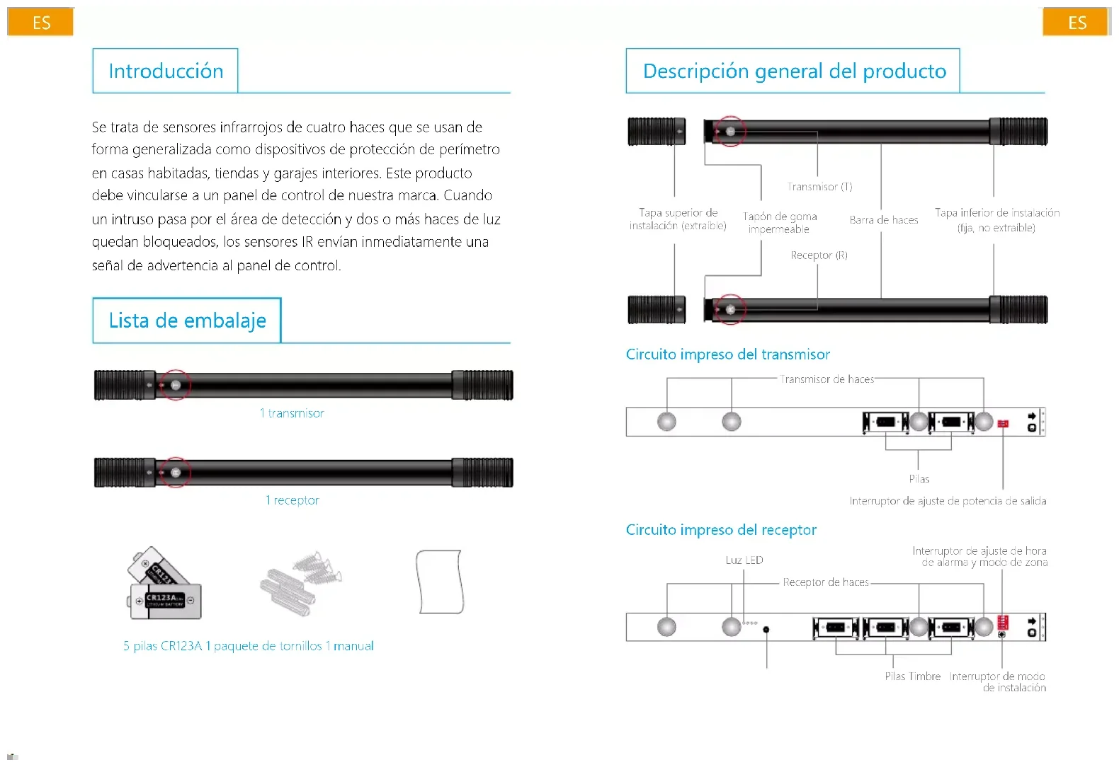 doek af. Als er zich stof, modder of sneeuw op de balken bevindt, veeg ze dan onmiddellijk af. Specicaties Infrarood detectiebundel: 4 bundels Batterij zender: 2 batterijen CR123A, 3 V Batterij ontvanger: 3 batterijen CR123A, 3 V Stand-bytijd: 3 jaar Opgenomen vermogen stand-bymodus: Zender < 0,03 mA; Ontvanger < 0,08 mA Opgenomen vermogen alarmmodus: 16 mA Maximaal detectiebereik: 6 m Classicatie waterdichtheid: IP66 Draadloze frequentie: 433 MHz Draadloze zendafstand < 80 m (open ruimte/geen interferentie) Materiaal: PC + ANTI-UV ERP (dBm) Max.: -7.44 Afmetingen: 42 x 47 x 612 mmESES Introducción Se trata de sensores infrarrojos de cuatro haces que se usan de forma generalizada como dispositivos de protección de perímetro en casas habitadas, tiendas y garajes interiores. Este producto debe vincularse a un panel de control de nuestra marca. Cuando un intruso pasa por el área de detección y dos o más haces de luz quedan bloqueados, los sensores IR envían inmediatamente una señal de advertencia al panel de control. Lista de embalaje 1 transmisor 1 receptor 5 pilas CR123A 1 paquete de tornillos 1 manual Descripción general del producto Tapa superior de instalación (extraíble) Tapón de goma impermeable Transmisor (T) Receptor (R) Barra de haces Tapa inferior de instalación (ja, no extraíble) Circuito impreso del transmisor Transmisor de haces Pilas Interruptor de ajuste de potencia de salida Circuito impreso del receptor Luz LED Receptor de haces Pilas Timbre Interruptor de ajuste de hora de alarma y modo de zona Interruptor de modo de instalaciónESES Advertencia de batería baja La luz LED parpadea una vez cada tres segundos. Cuando se conecte a un panel de control GSM o Wi-Fi, el usuario recibirá un mensaje de texto o noticación de la aplicación con la advertencia de batería baja. Sustituya las pilas lo antes posible. Conguración Antes de iniciar la conguración, quite la tapa de instalación superior (con la marca ) y los tapones de goma impermeables del transmisor y el receptor, saque ambos circuitos impresos e inserte las pilas (preste atención a la polaridad "+" y "-"). Ajuste de la potencia de salida - Situado en el "Transmisor" (unidad T) Para ajustar la capacidad de salida, deslice el interruptor 1 del interruptor de ajuste de potencia de salida. Conguración predeterminada de fábrica Ajuste de salida alta Ajuste de salida baja Ajuste de salida alta: ≥ 3 m del receptor Ajuste de salida baja: < 3 m del receptor Ajuste de modo de zona - Situado en el "Receptor" (unidad R) Los tipos de modo de zona determinan si el panel de control recibe la alarma y responde en consecuencia. Se puede ajustar el modo de zona deslizando los interruptores 2 y 3 del interruptor de ajuste de hora de alarma y modo de zona. Zona 24H Zona normal (predeterminado de fábrica) Zona de modo de hogar Zona 24 H: Los sensores IR están en modo de alerta en todas circunstancias. Al detectar una intrusión, el panel de control activa la alarma. Es mejor usarlo en zonas importantes a las que no se acceda habitualmente. Zona de modo de hogar: Cuando se activa el sistema de alarma, los sensores IR están preparados para actuar. Al detectar una intrusión, el panel de control activa la alarma. Cuando el sistema de alarma está desactivado o activado en modo de hogar, el panel de control no activa la alarma aunque se disparen los sensores IR. Es mejor usarlo en zonas comunes a las que tengan acceso tanto miembros de la familia como intrusos. Zona normal (Zona de armado): Cuando el sistema de alarma está activado o activado en modo de hogar, los sensores IR están en guardia y el panel de control activa inmediatamente la alarma si se disparan los sensores. Cuando el sistema de alarma está desactivado, el panel de control no activa la alarma aunque se disparen los sensores. Es mejor usarlo en zonas a las que puedan acceder intrusos pero los miembros de la familia tengan acceso limitado.ESES Ajuste de la hora de alarma - Situado en el "Receptor" (unidad R) Cuando dos o más haces quedan bloqueados a la hora predenida, los sensores IR envían una señal de alarma al panel de control Se puede ajustar la hora deslizando los interruptores 4 y 5. Conguración predeterminada de fábrica La alarma se disparará cuando el haz de luz quede bloqueado durante 0,3 segundos.La alarma se disparará cuando el haz de luz quede bloqueado durante 0,6 segundos.La alarma se disparará cuando el haz de luz quede bloqueado durante 0,9 segundos.La alarma se disparará cuando el haz de luz quede bloqueado durante 1,2 segundos. Nota: El ajuste de hora debe ser práctico y adecuarse a la zona de detección. No quiere decir que CUANTO MÁS CORTO MEJOR ES. Vinculación Después de realizar la conguración, vincule los sensores IR al panel de control.