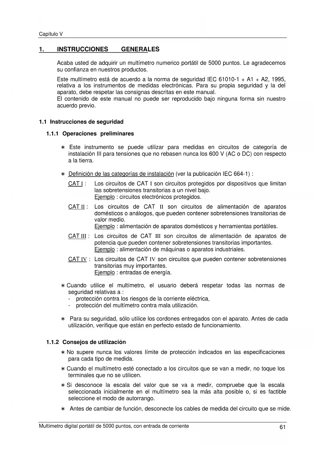 Acaba usted de adquirir un multímetro numerico portátil de 5000 puntos. Le agradecemos su confianza en nuestros productos. Este multímetro está de acuerdo a la norma de seguridad IEC 61010-1 + A1 + A2, 1995, relativa a los instrumentos de medidas electrónicas. Para su propia seguridad y la del aparato, debe respetar las consignas descritas en este manual. El contenido de este manual no puede ser reproducido bajo ninguna forma sin nuestro acuerdo previo.
