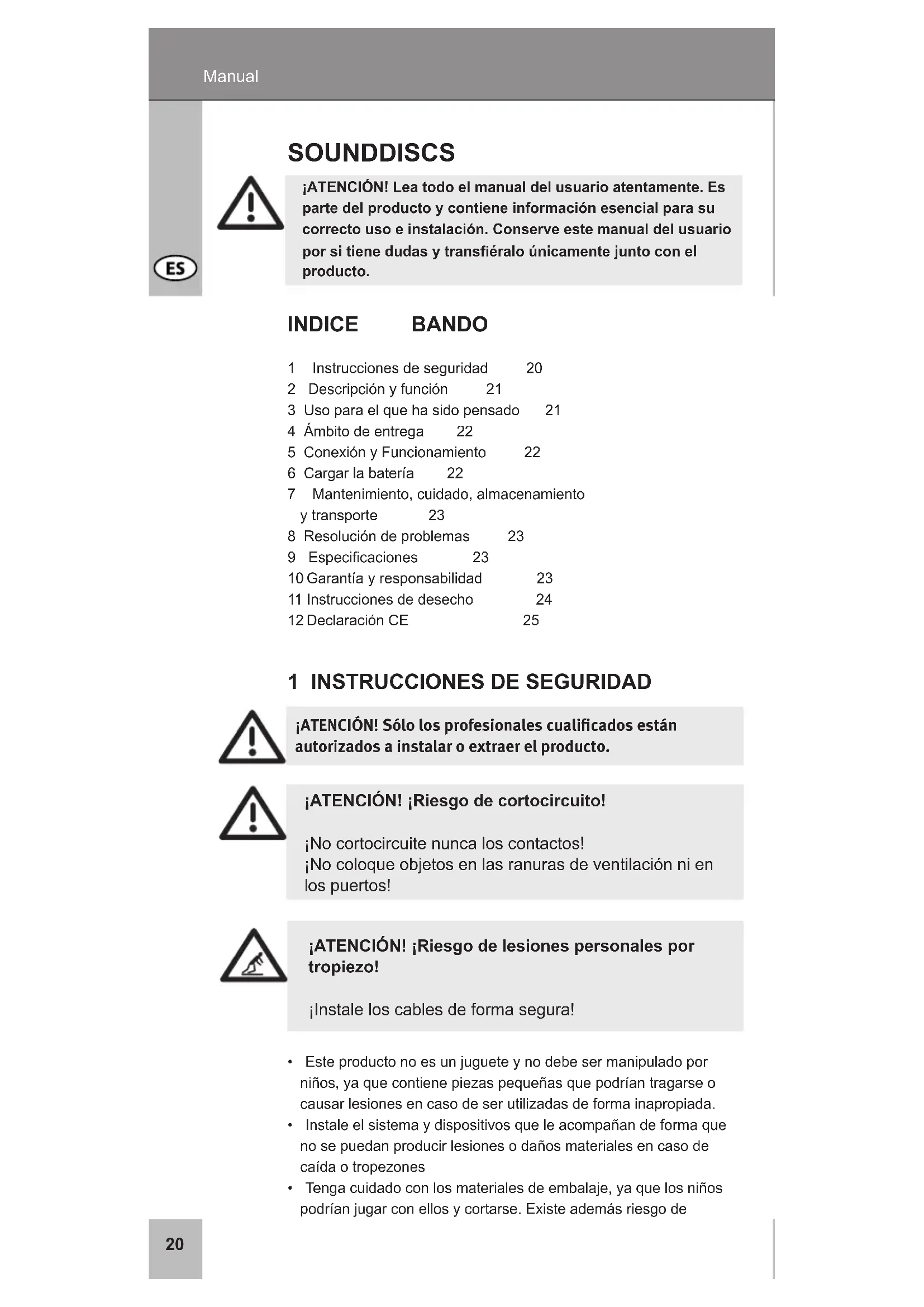 nomcommercialdéposédeWentronicGmbH,déclare quel‘appareilestconformeauxconditionsetdirectivesdebasede laréglementationeuropéenne.Vouspouvezconsulterlesitewww. cabstone.compourdeplusamplesinformations.20 Manual ¡ATENCIÓN! Lea todo el manual del usuario atentamente. Es parte del producto y contiene información esencial para su correcto uso e instalación. Conserve este manual del usuario por si tiene dudas y transéralo únicamente junto con el producto. SOUNDDISCS INDICE BANDO 1 Instruccionesdeseguridad 20 2 Descripciónyfunción 21 3Usoparaelquehasidopensado 21 4 Ámbito de entrega 22 5ConexiónyFuncionamiento 22 6 Cargar la batería 22 7 Mantenimiento,cuidado,almacenamiento ytransporte 23 8Resolucióndeproblemas 23 9 Especicaciones 23 10Garantíayresponsabilidad 23 11Instruccionesdedesecho 24 12DeclaraciónCE 25