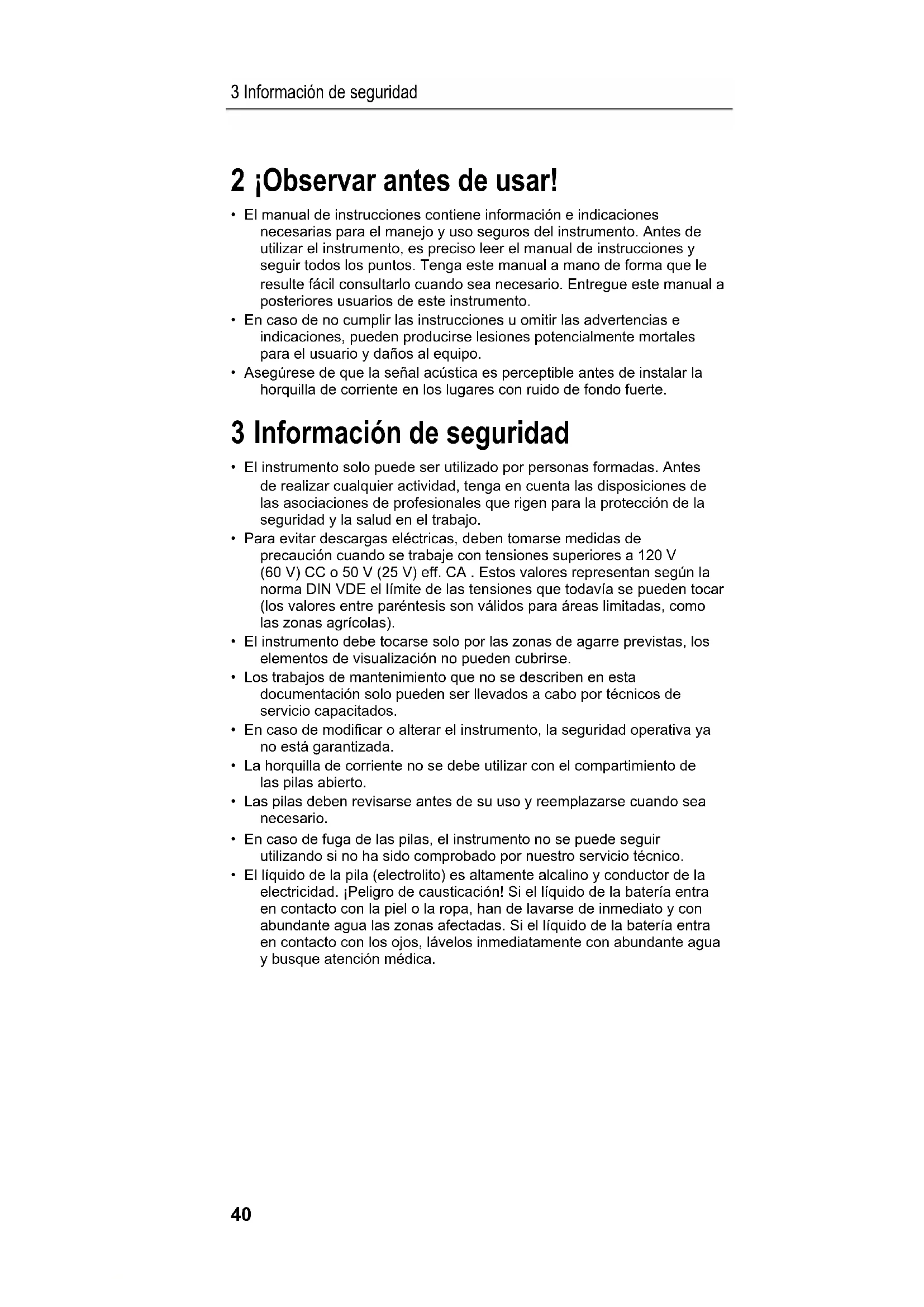 - Compruebe el funcionamiento correcto (por ejemplo, en una fuente de tensión conocida) antes y después de cada prueba.